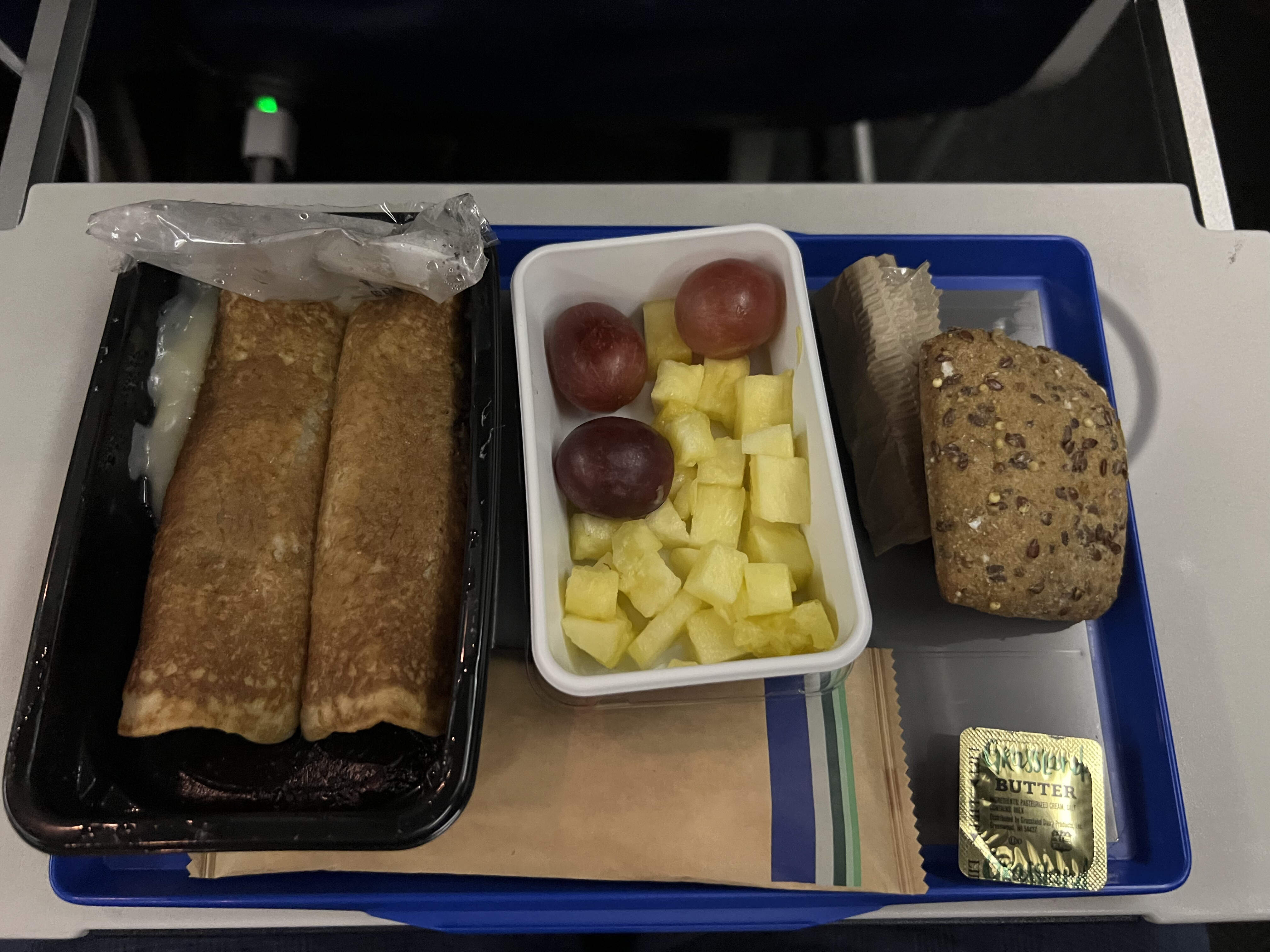 Pancakes with fruit salad and bread for breakfast before landing, not bad. The other choice was an egg dish.