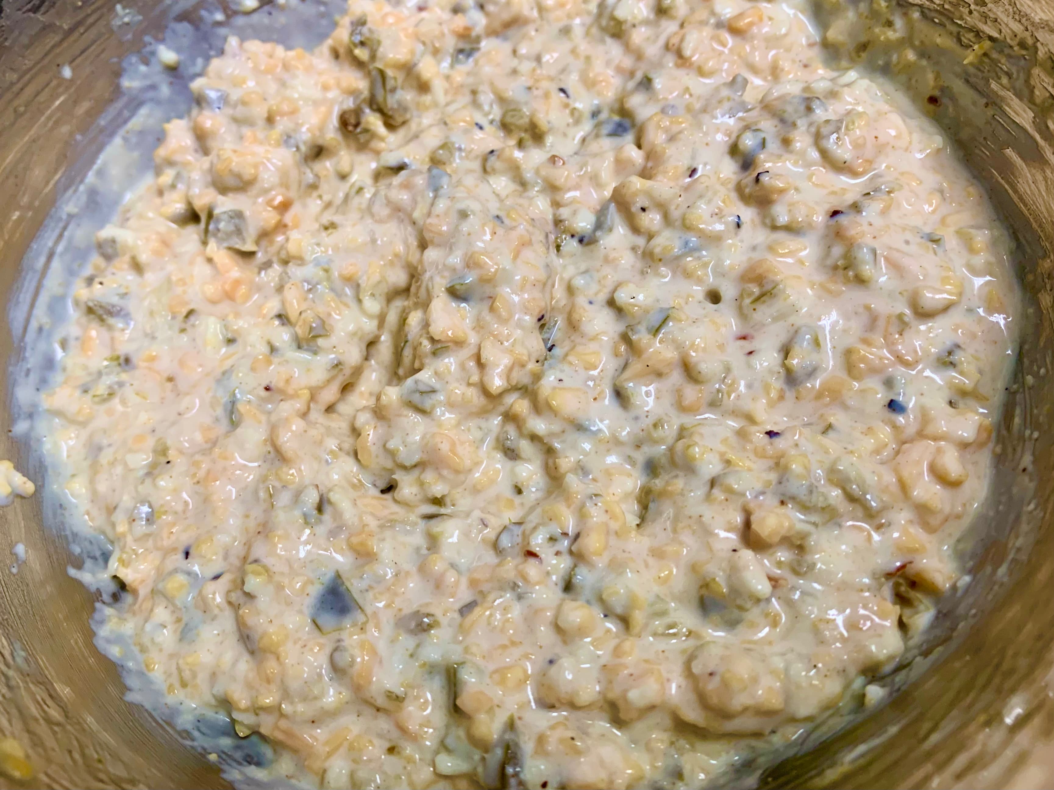 …the basics are Cheddar cheese, mayonnaise, jalapeño and liquid smoke.