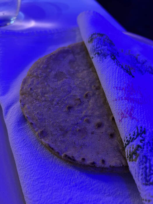Escamoles / ant larvae taco on blue corn tortillas.
