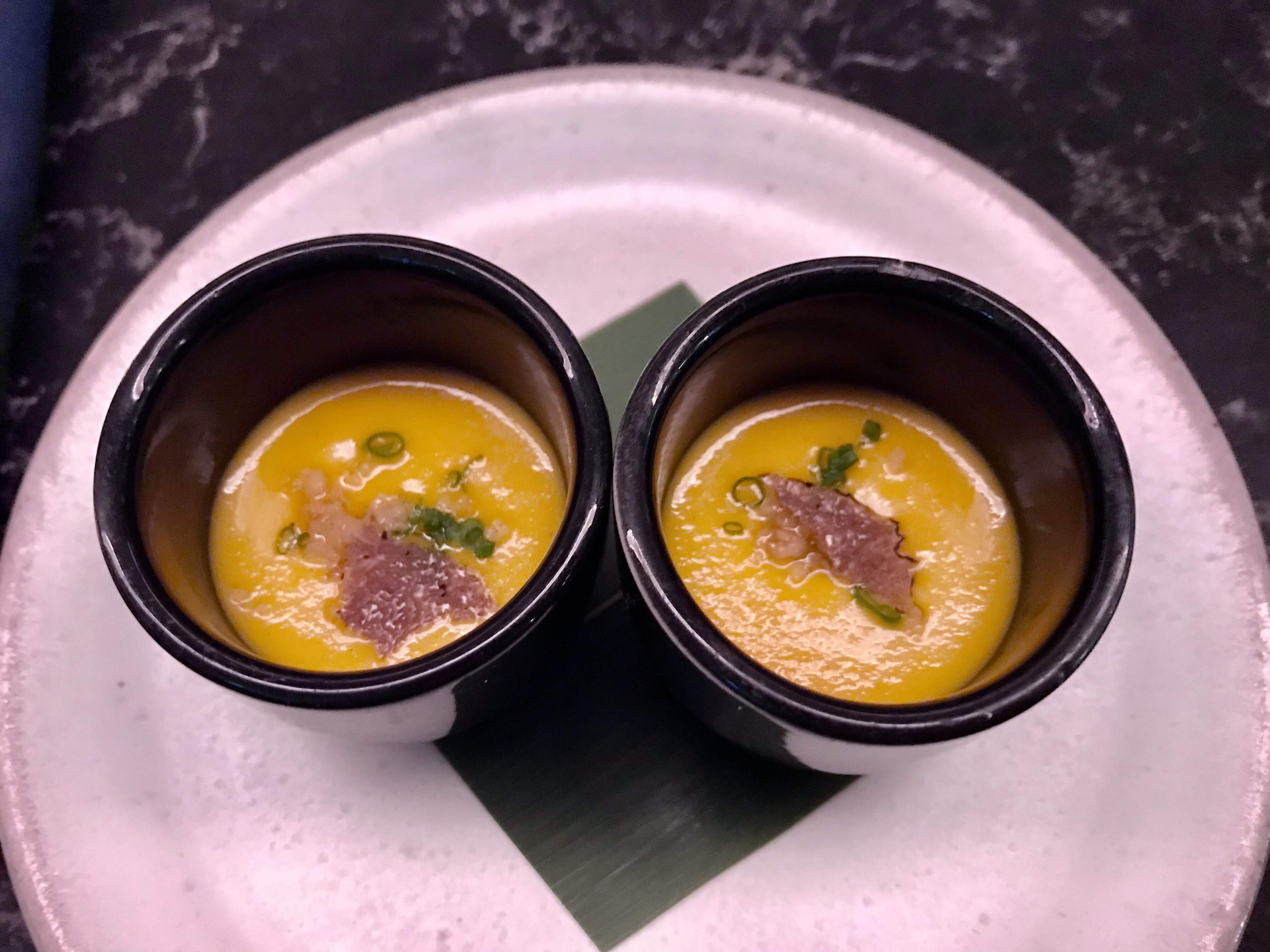 They started us off with a lovely amuse of butternut squash and coconut soup, with truffle and something crunchy.