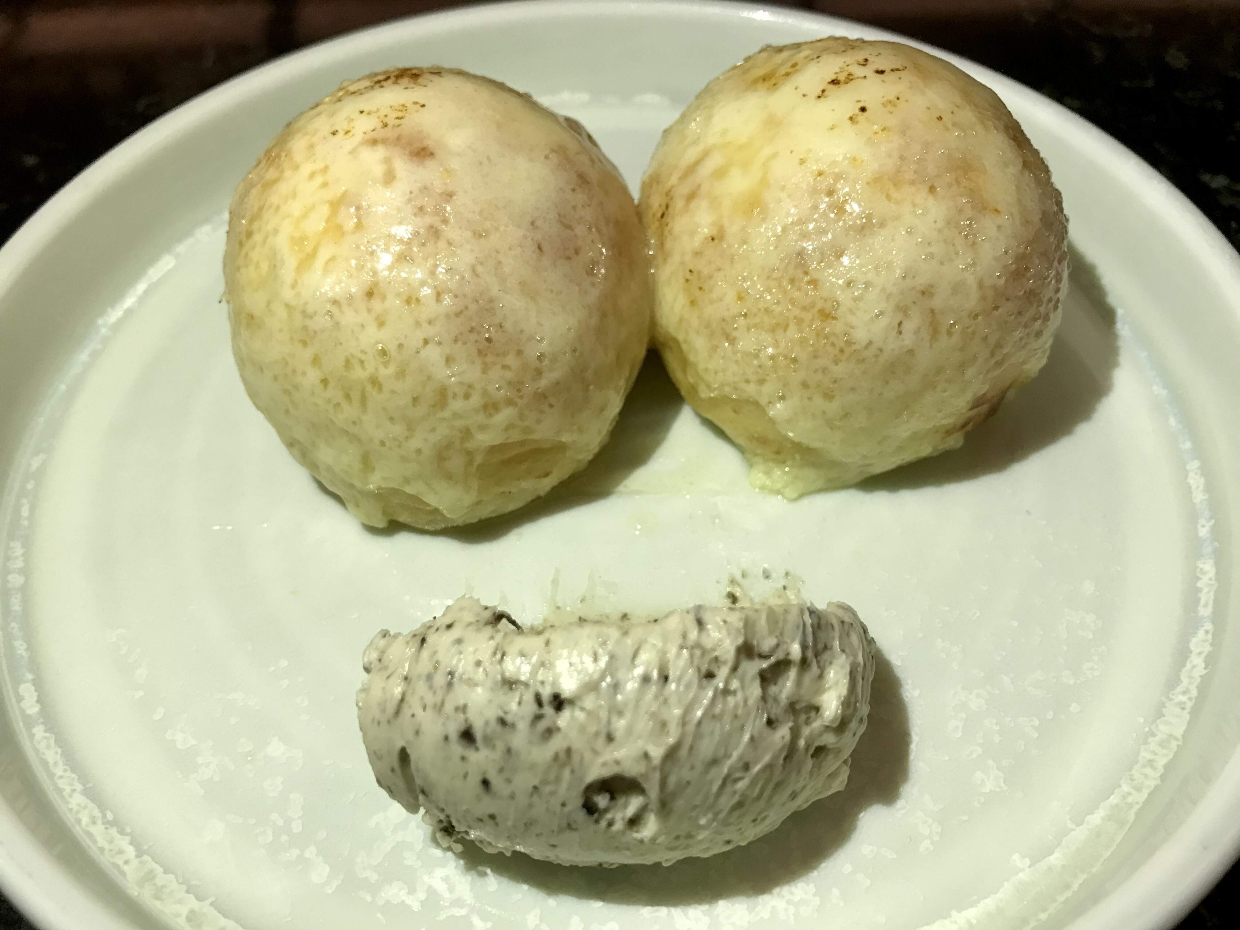 An order of Ensaymada brought brioche-like, cheddar-y bread, served with fragrant porcini butter and hojicha honey, to which we added supple housemade duck prosciutto with cantaloupe.