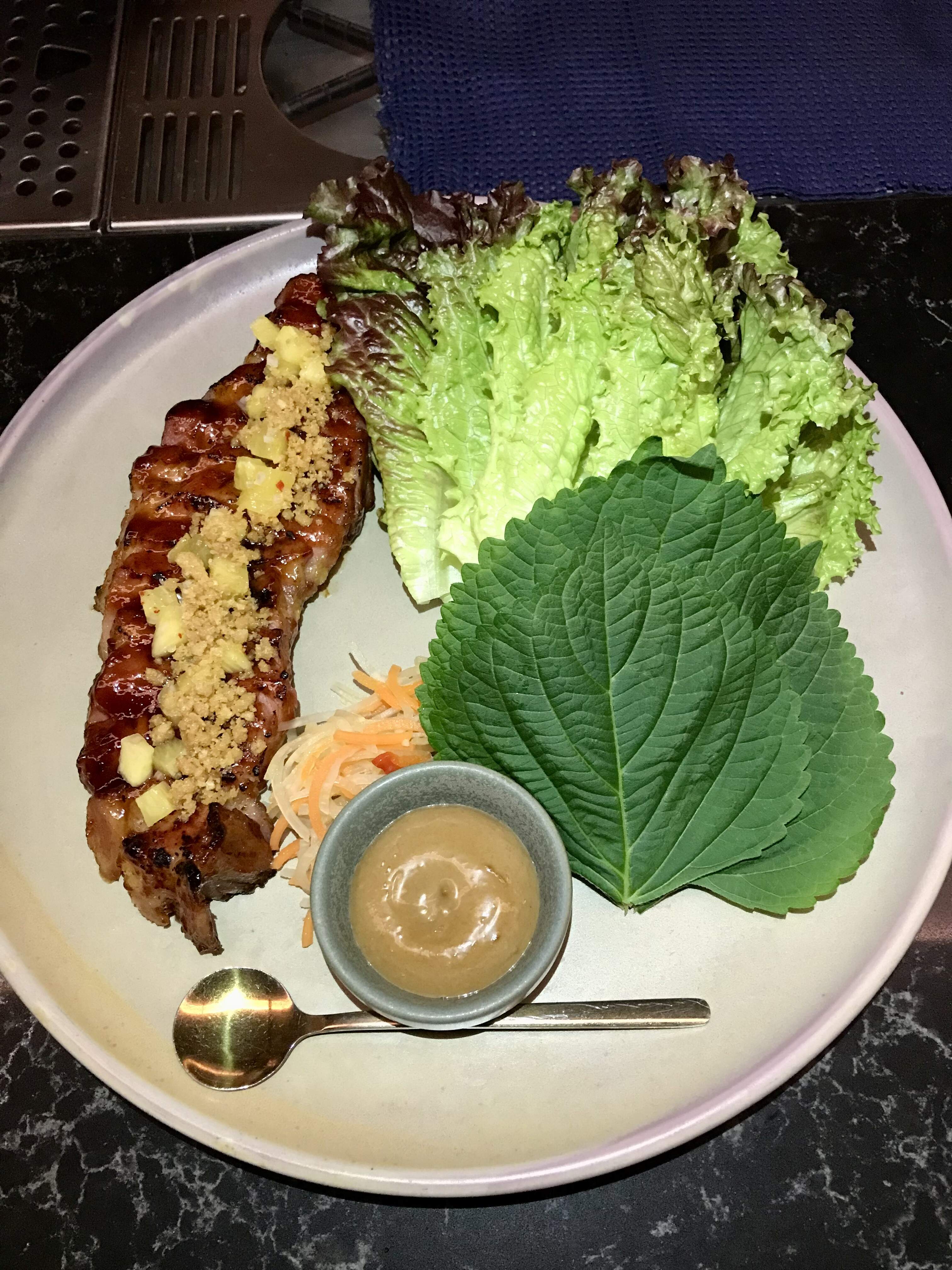 Ibérico Pork Collar had a Pinoy BBQ glaze and came with pineapple, chicharrón, black garlic aioli, atchara, carrot and daikon pickles, and shiso, all to throw into lettuce leaves for eating - yummy and fun.