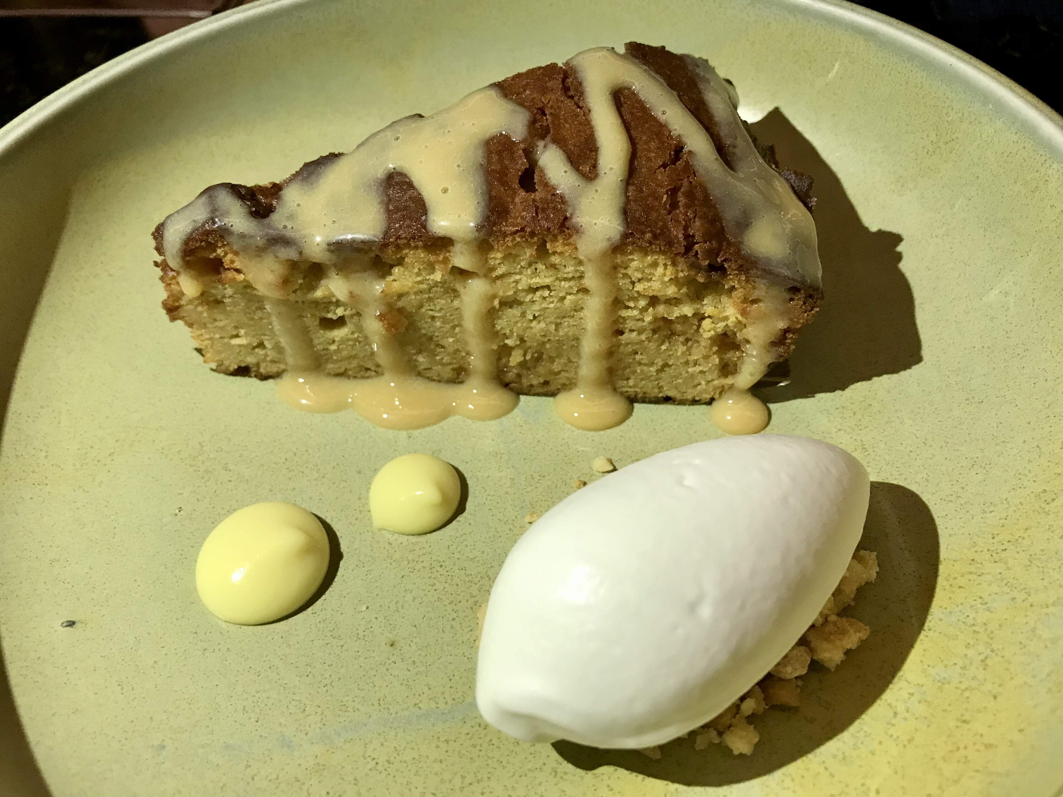 We had space for one dessert and tried the Miso + Mascarpone Bibingka, a dense and not-to-sweet cake, served with a coconut pandan sorbet, and rum dulce de leche. Good but not essential. The Halo Halo cocktail was better.