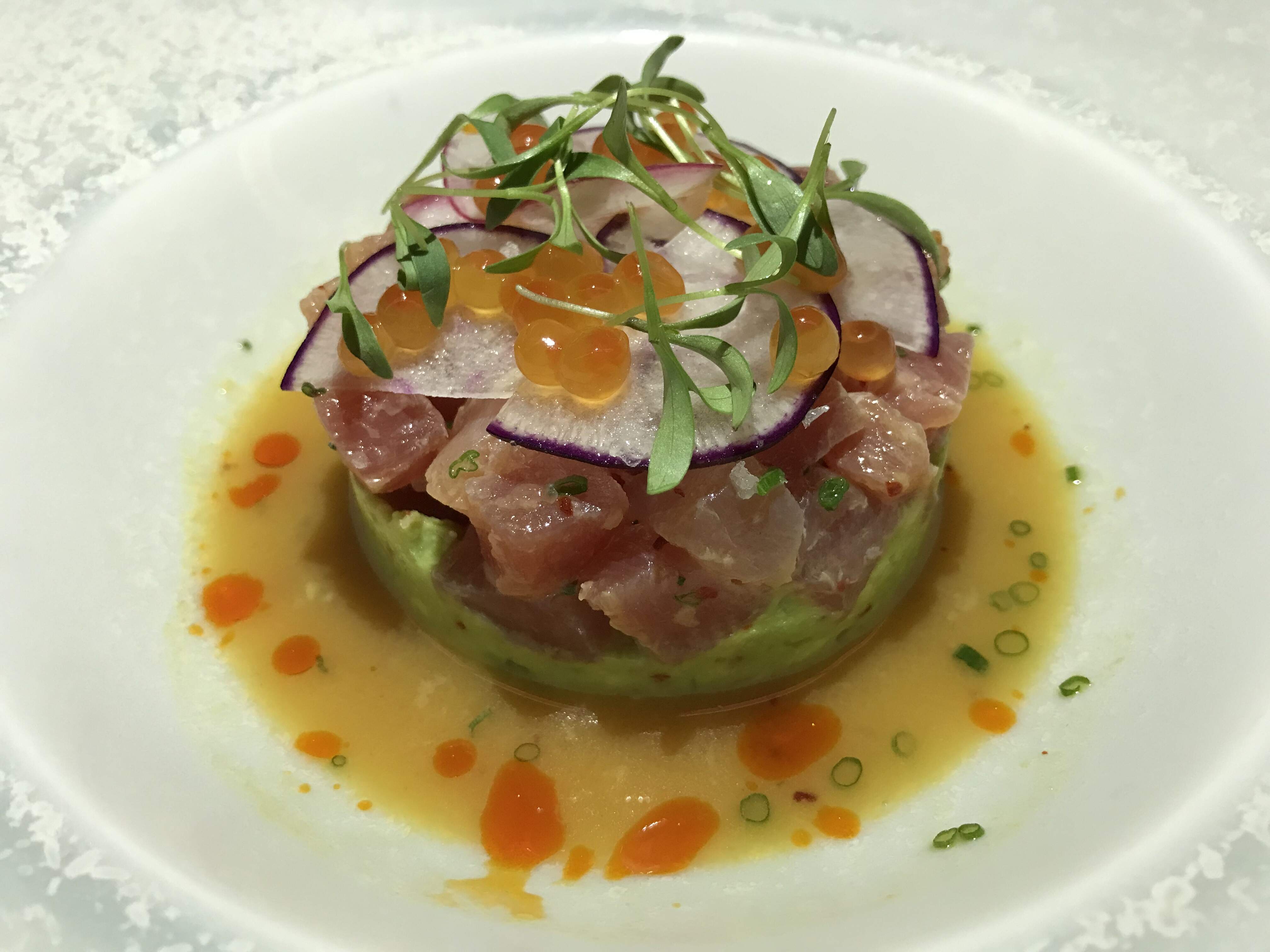 Our server told us that the Tuna Kinilaw featured albacore tuna (generally sustainable), but when it arrived its red-pink hue said otherwise (turned out to be the less likely to be sustainable yellowfin). Too bad, as otherwise it was enhanced beautifully with passionfruit and calamansi marinade, ikura, avocado mousse, watermelon radish, and came with crab chips.