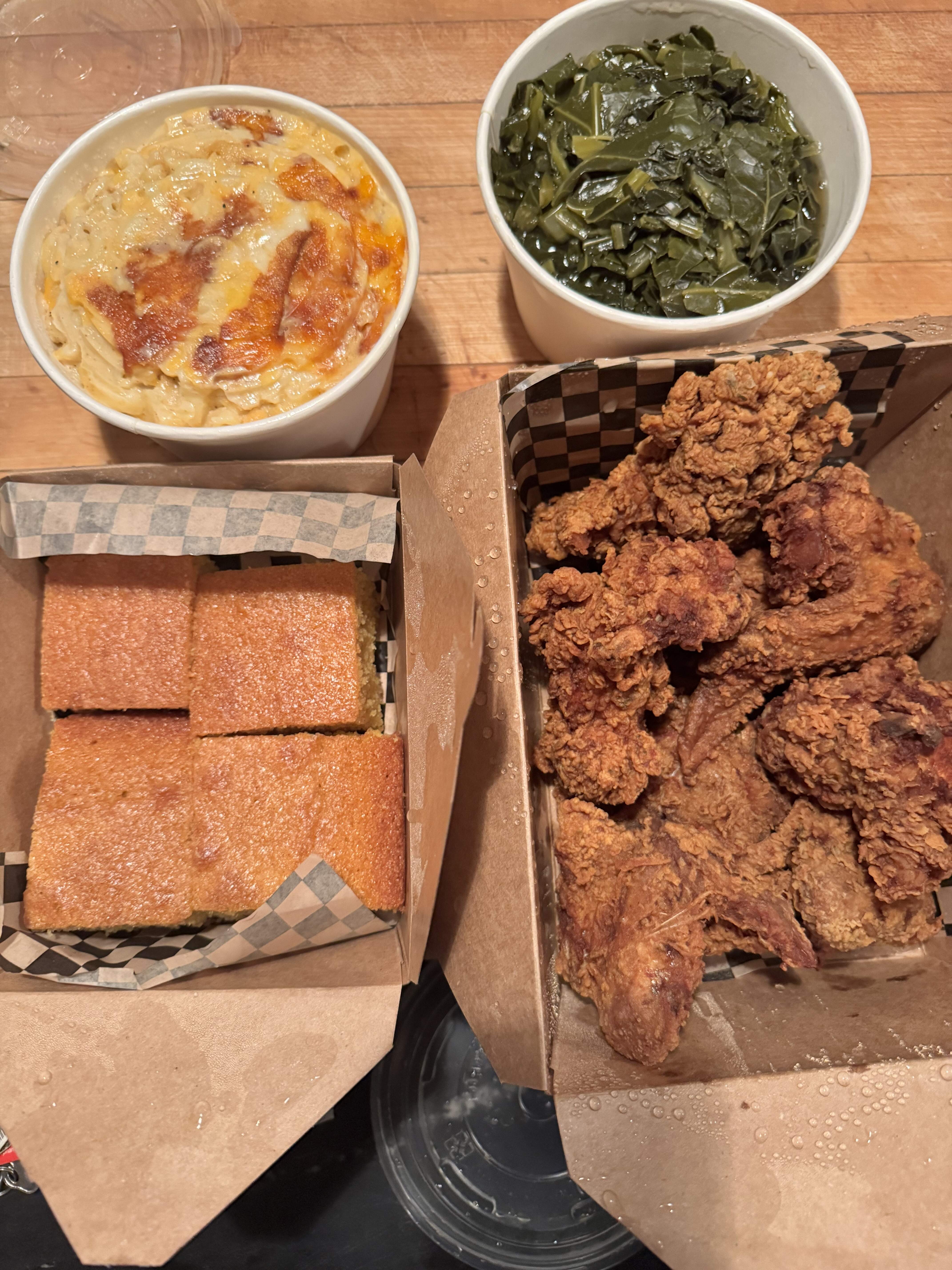 Delicious chicken, very good greens, great banana pudding, and very friendly service at the bar.