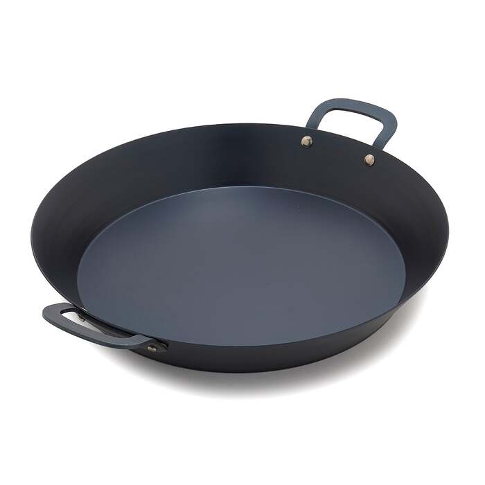 I recently got a Green Pan 15” carbon steel paella pan at Costco for $26. I really like the large flat surface. It’s nonstick but I’m not sure how it’s done.