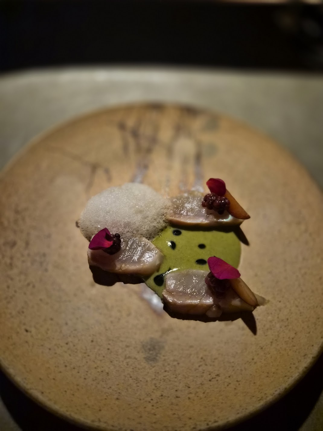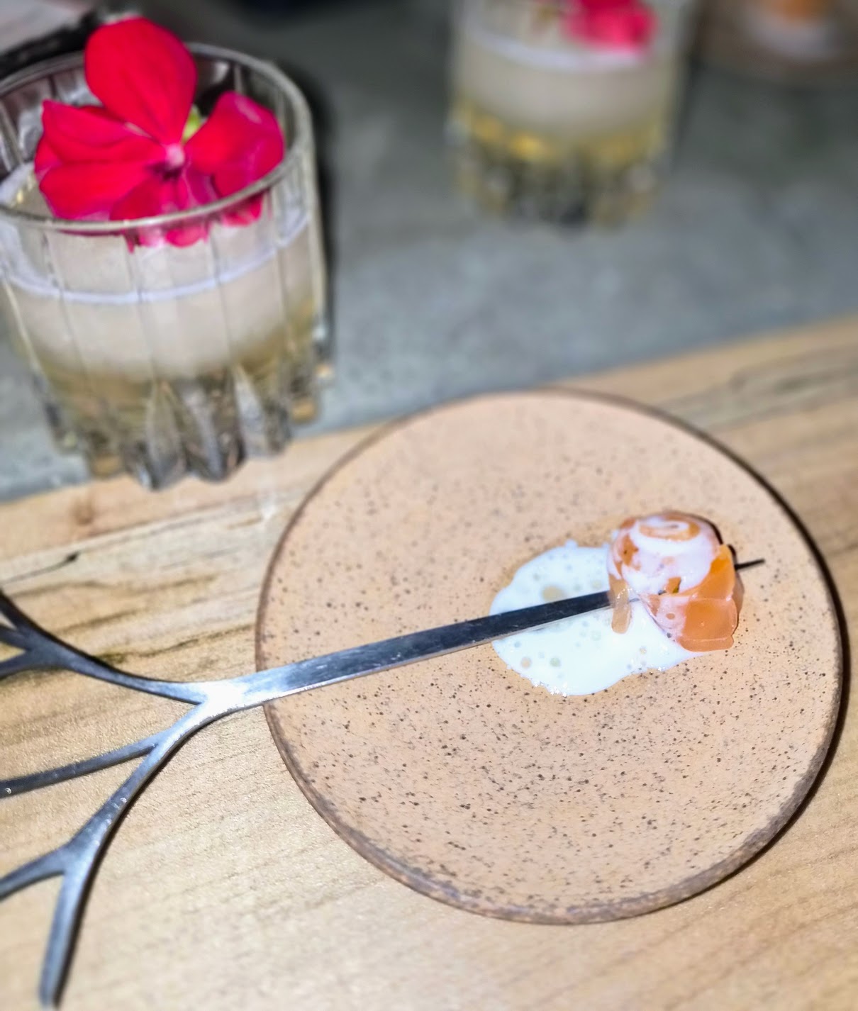 We started with a mocktail of pineapple weed, elderflower and wild mint. It tasted like a tropical cocktail. I would not have guessed this combination of ingredients was in it. Served along with it was sashimi quality salmon with a buttermilk foam: