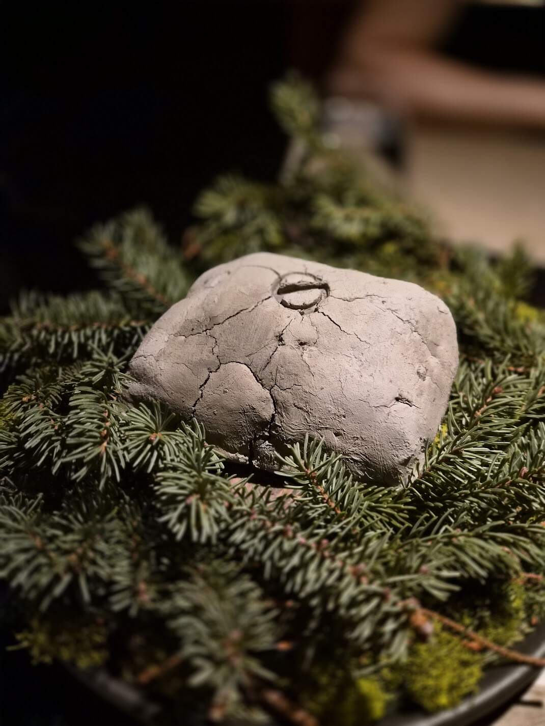 Trout, Labrador tea and fermented spruce. First presented in the clay it was cooked in. The hot clay activated the oils in the evergreen branches it was on. The beautiful, piney aroma led into the fermented spruce on the trout.