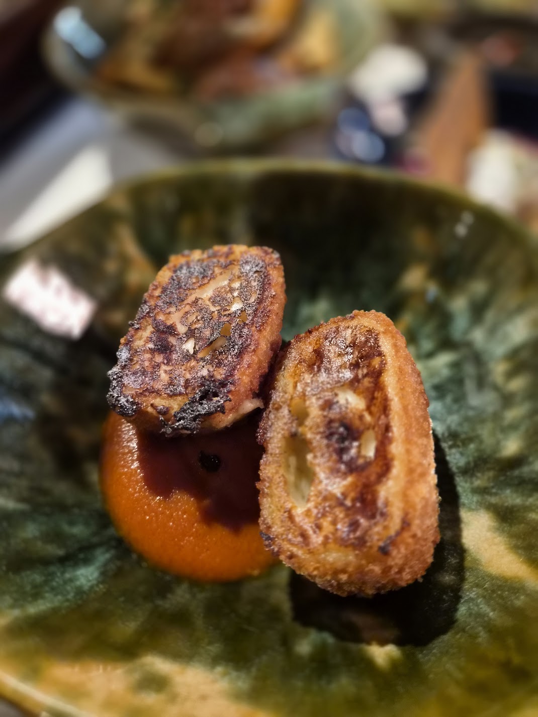 duck heart with viburnum berry beside duck gizzard in phyllo: