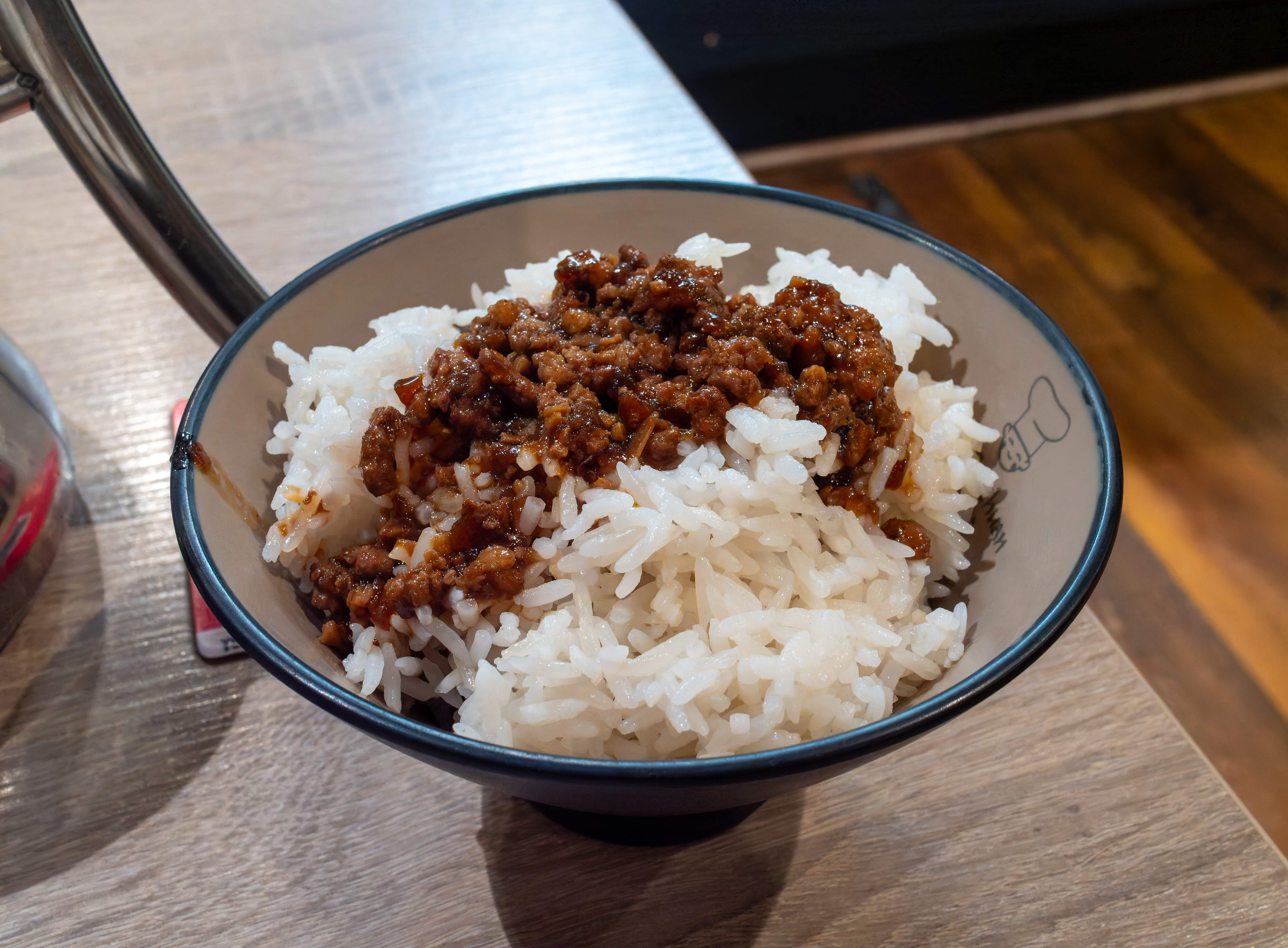 And it comes with a side - a choice of plain rice, rice with minced pork, brown rice, scallion paste noodles, fried rice, or fried noodles. I picked the rice with minced pork, which was steamed rice with a little bit of minced pork in a soy based gravy.
