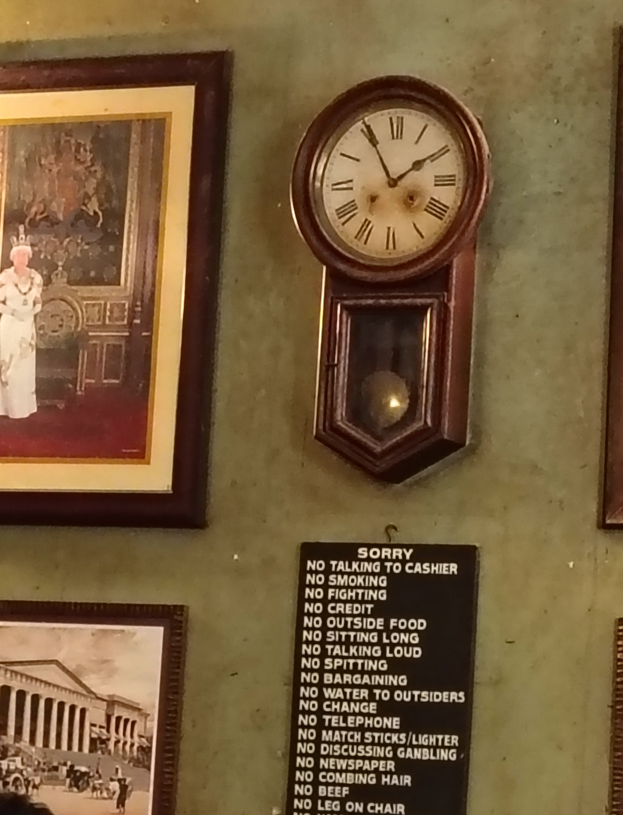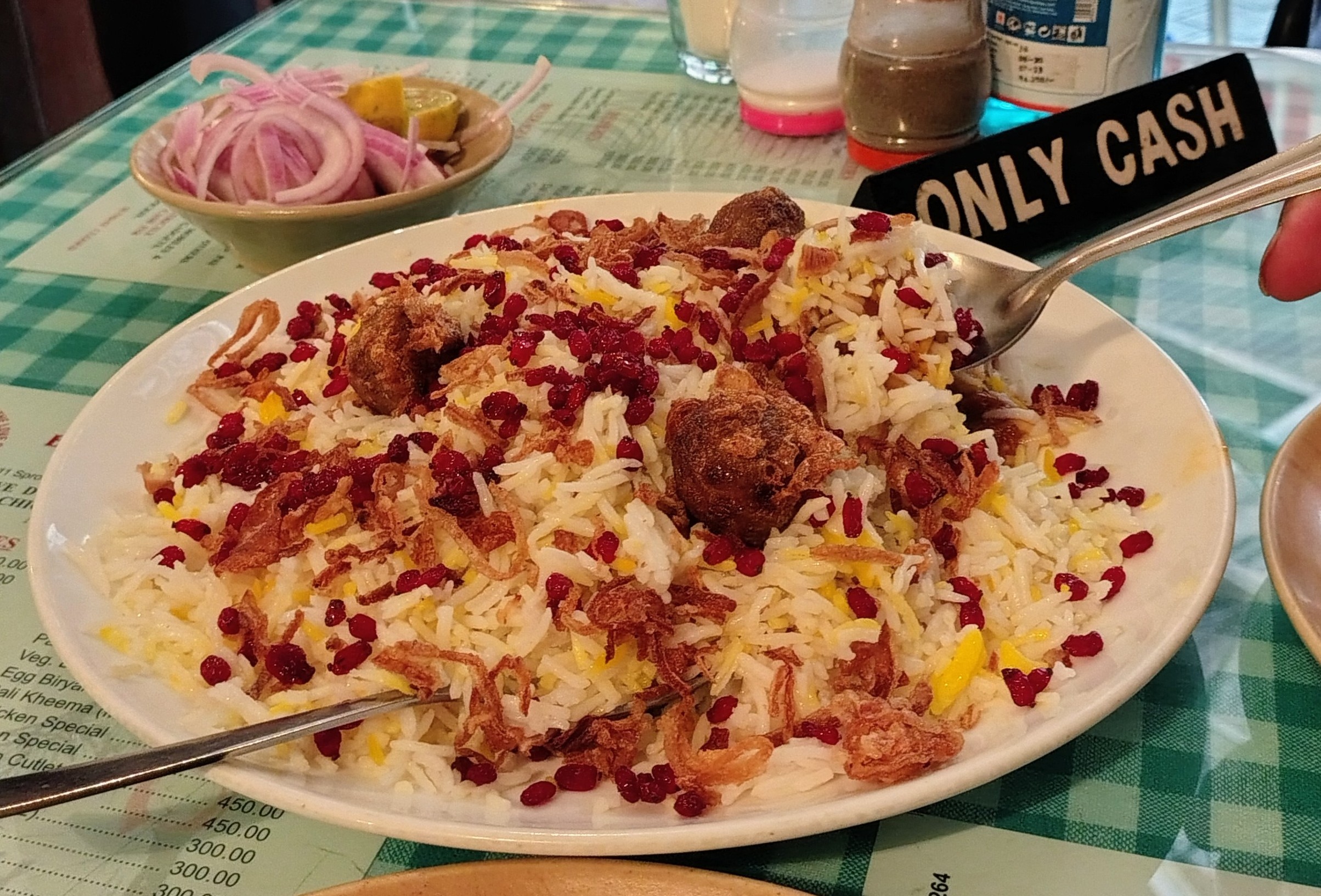 The place isn’t exactly welcoming, with signs everywhere reminding you it’s cash only, a big jokey list of rules, a grumpy cashier and slightly anxious servers wearing white shirts with black bow ties (this dress code for the servers was very much at odds with the dog on the counter vibe). We ordered only 2 things - Bombay Duck fry and chicken berry pulao.