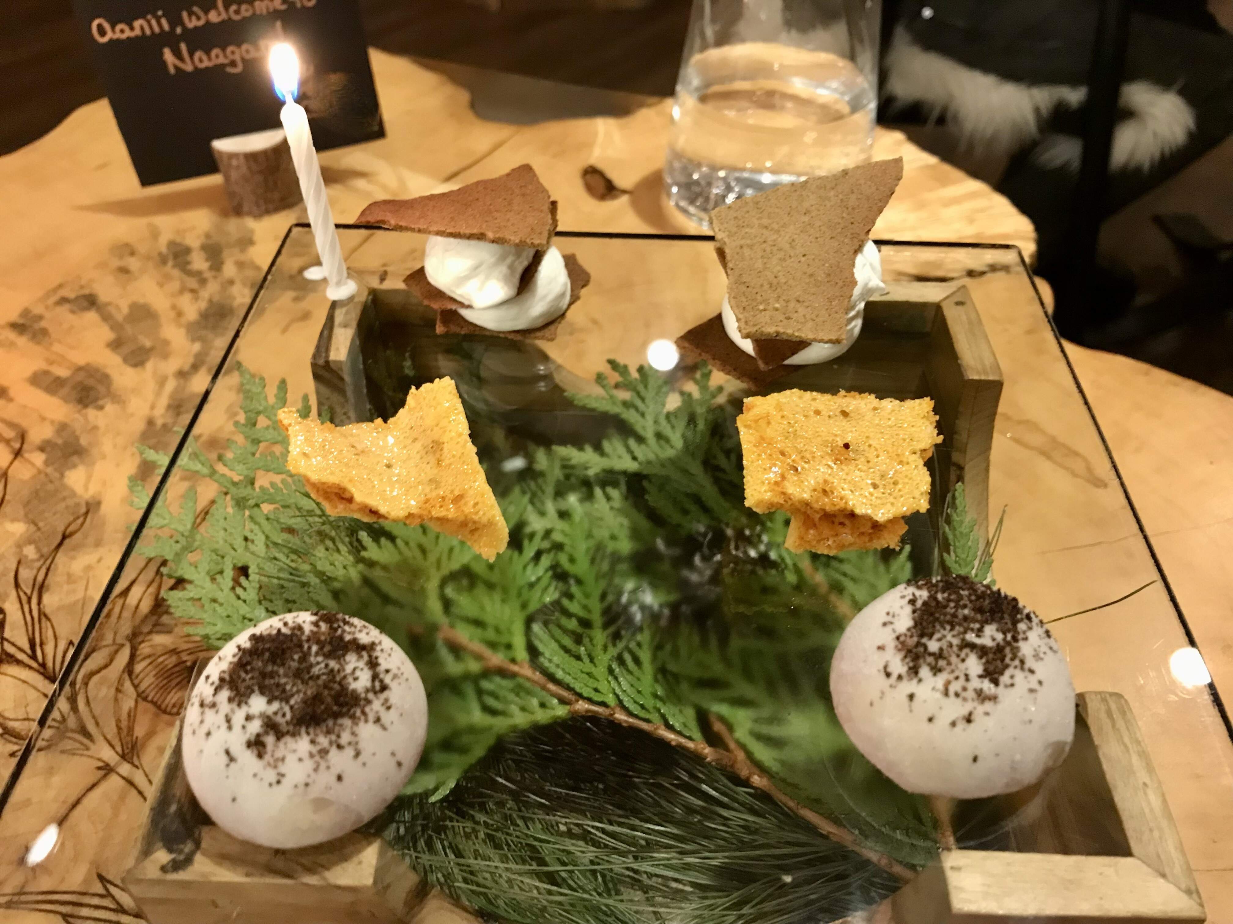 We finished with three small treats, served on a glass box with cedar branches inside which were blowtorched first for extra smoke: