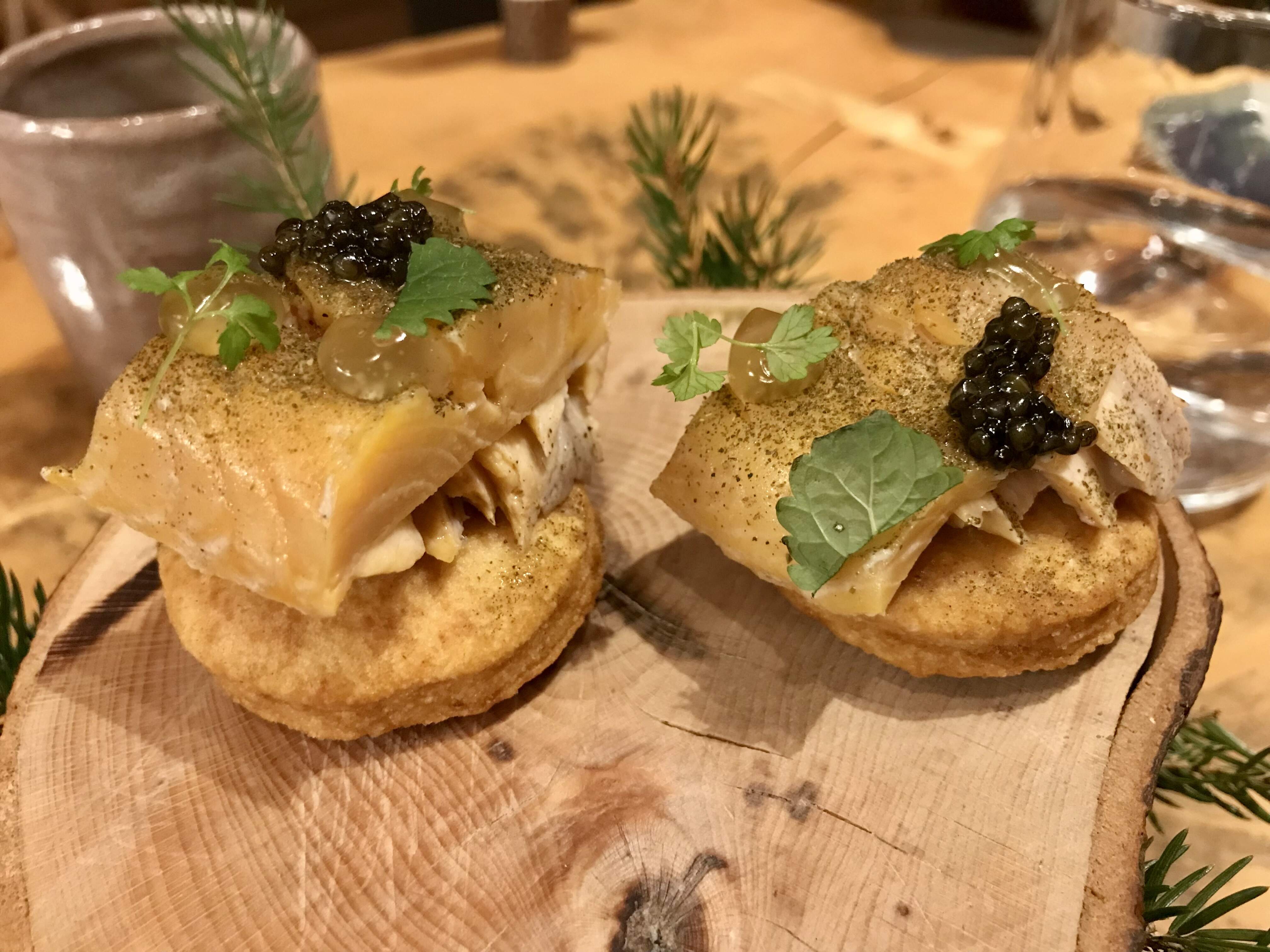 We started off with very subtle cedar tea, sweetened with maple syrup. This accompanied 4 hand held snacks: