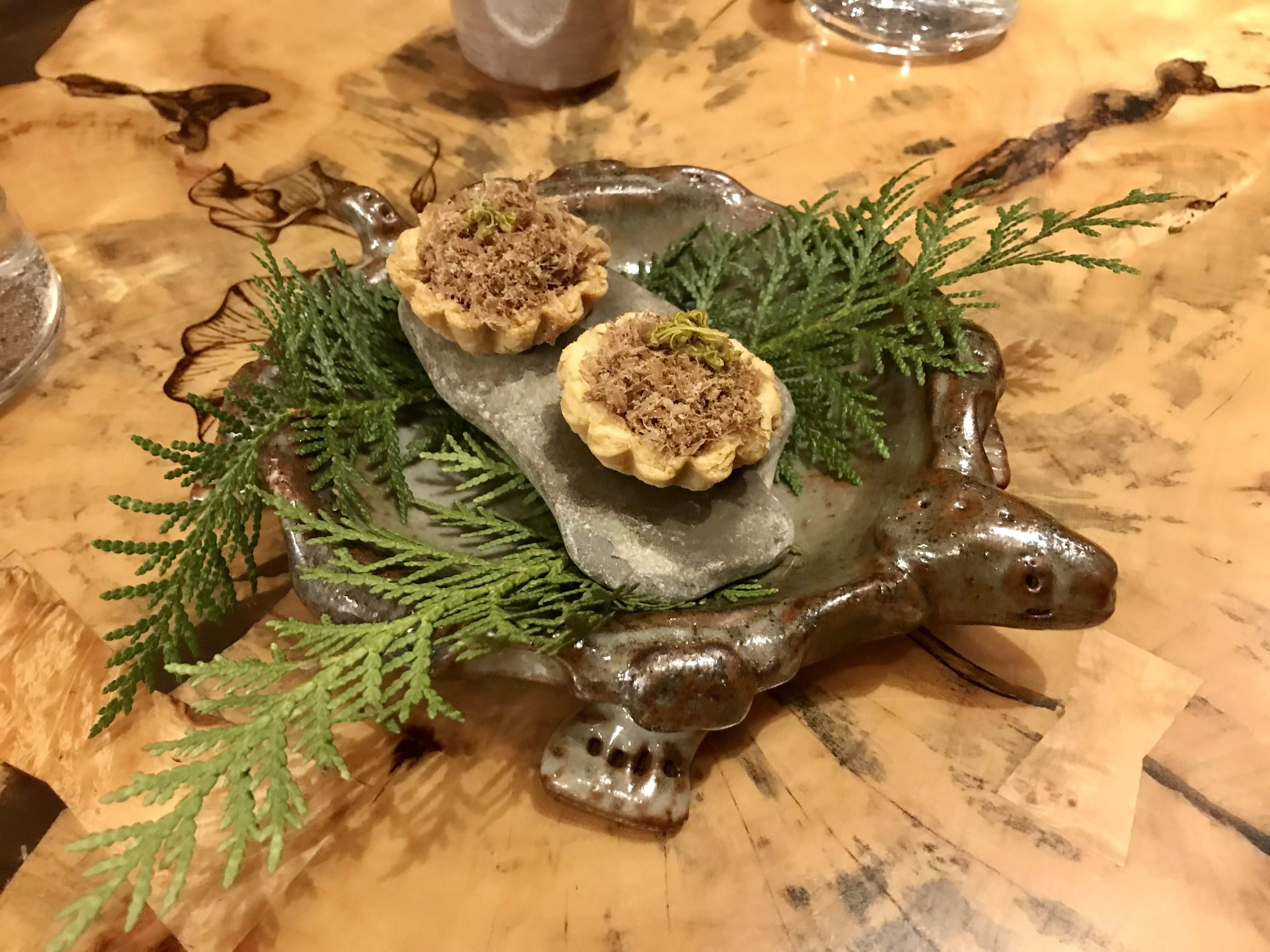 They serve no alcohol and instead offer a pairing of teas and juices, with some vinegar elements. Each course is plated at the same time for all tables and Chef Zach Keeshig then introduces each dish. He also periodically brings around a tray to show us some ingredients and explains how they were prepared. We got a close look at dried yellow oyster mushrooms that were harvested from a nearby felled elm tree, a dry aged duck seasoned over birch bark grill, smoked and dried bison heart, pigeons, and the chaga mushrooms that went into the dessert.