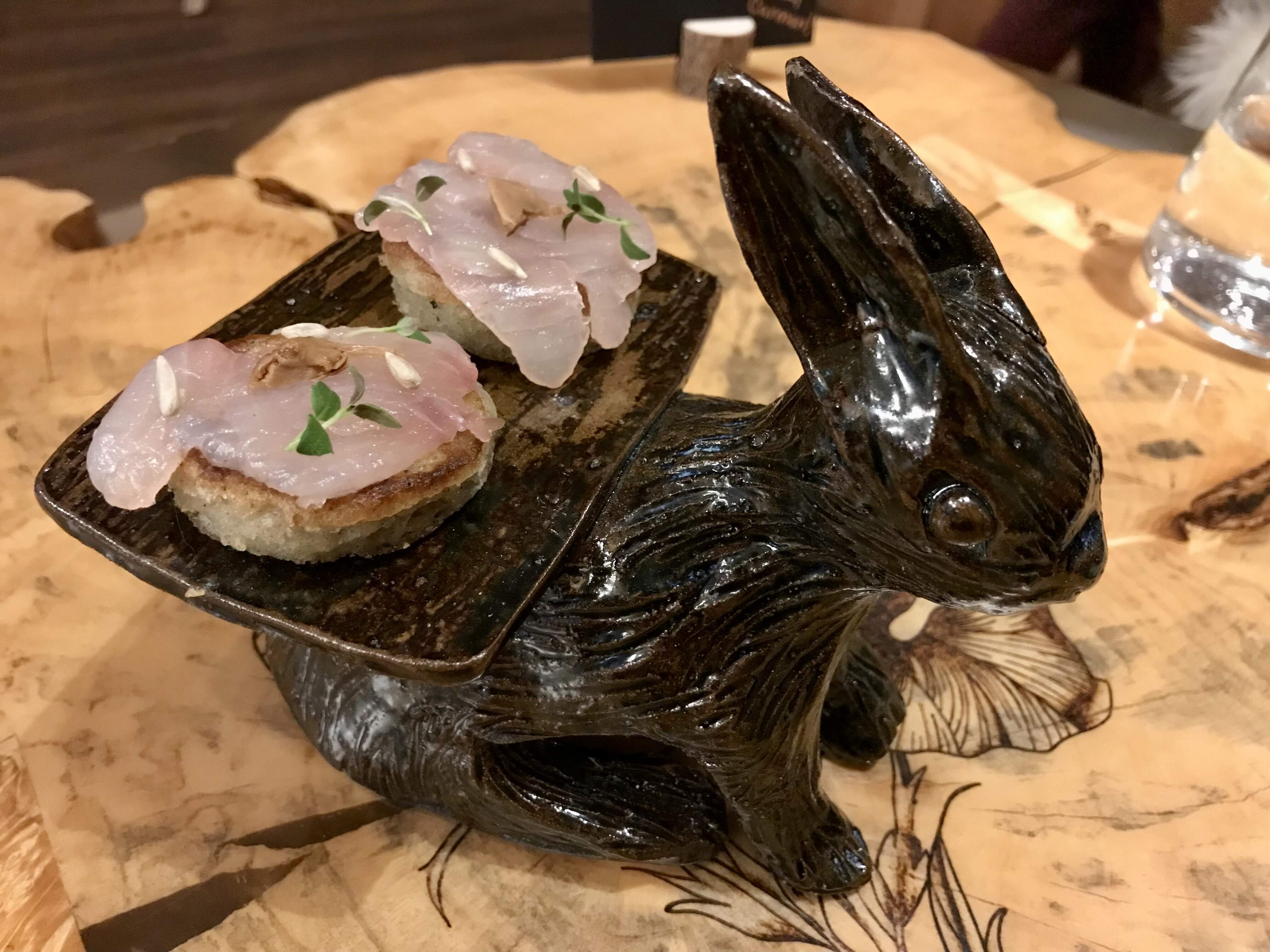- Local Indigenous-caught whitefish was dry-aged and cured, served on blini-like pancake of wild rice (manoomin), with roasted sunflower seeds, thyme, and pickled chanterelle, served on a pottery rabbit.