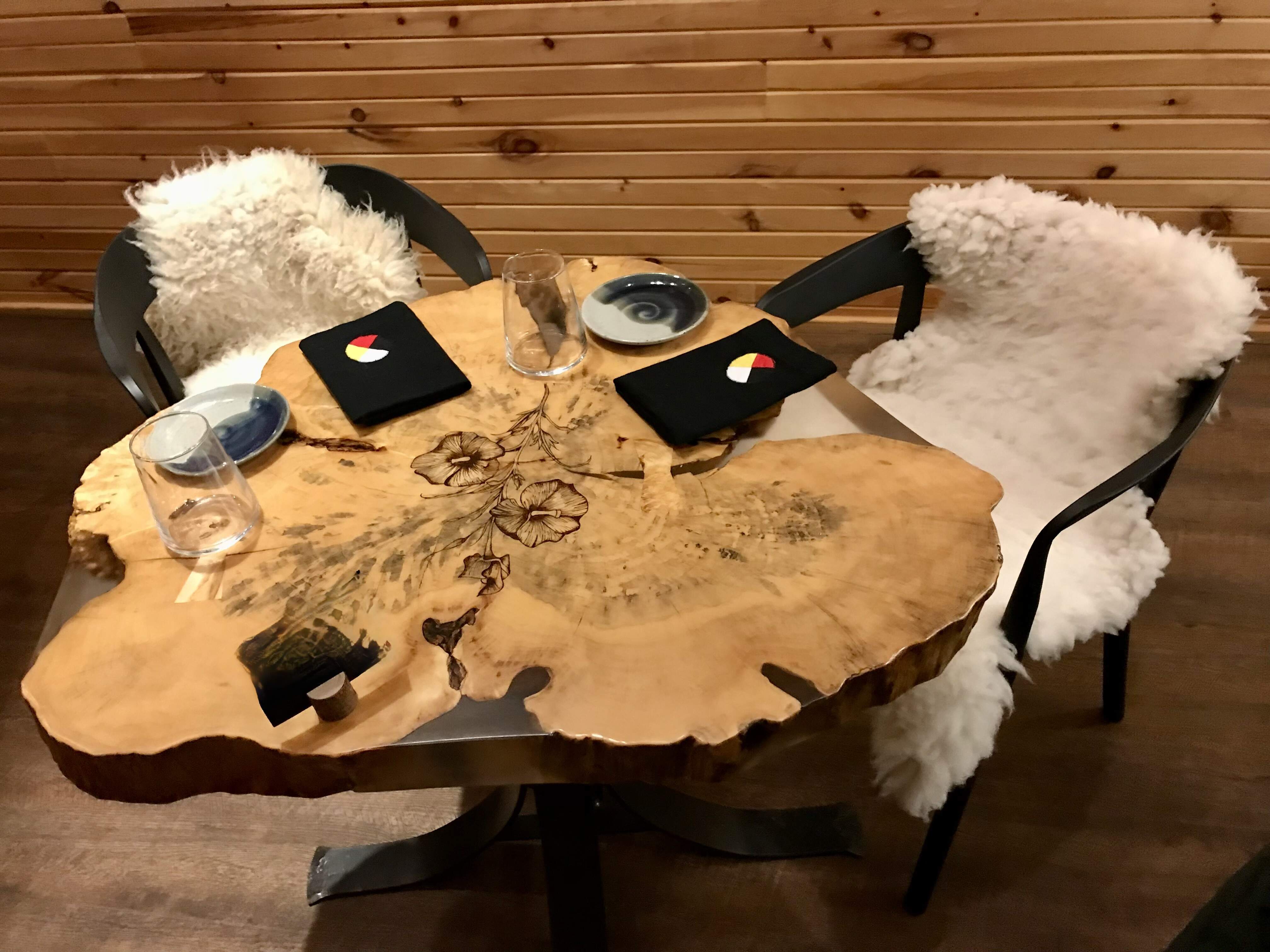 We have been wanting to try Naagan for some time and finally got an opportunity over the holiday break. There is only one seating at 6:30 pm and there are only about 17 seats total. While located on a downtown street in Owen Sound, the interior is quite peaceful. The room has stunning handmade wood tables with burned images (ours had a mallow rose), chairs with white sheepskin draped over the back, shelves filled with jars of house preserves, bunches of dried plants hanging from the ceiling, sumac branches, an otter pelt and beaver pelt, dream catchers, and fragrant burning sage.