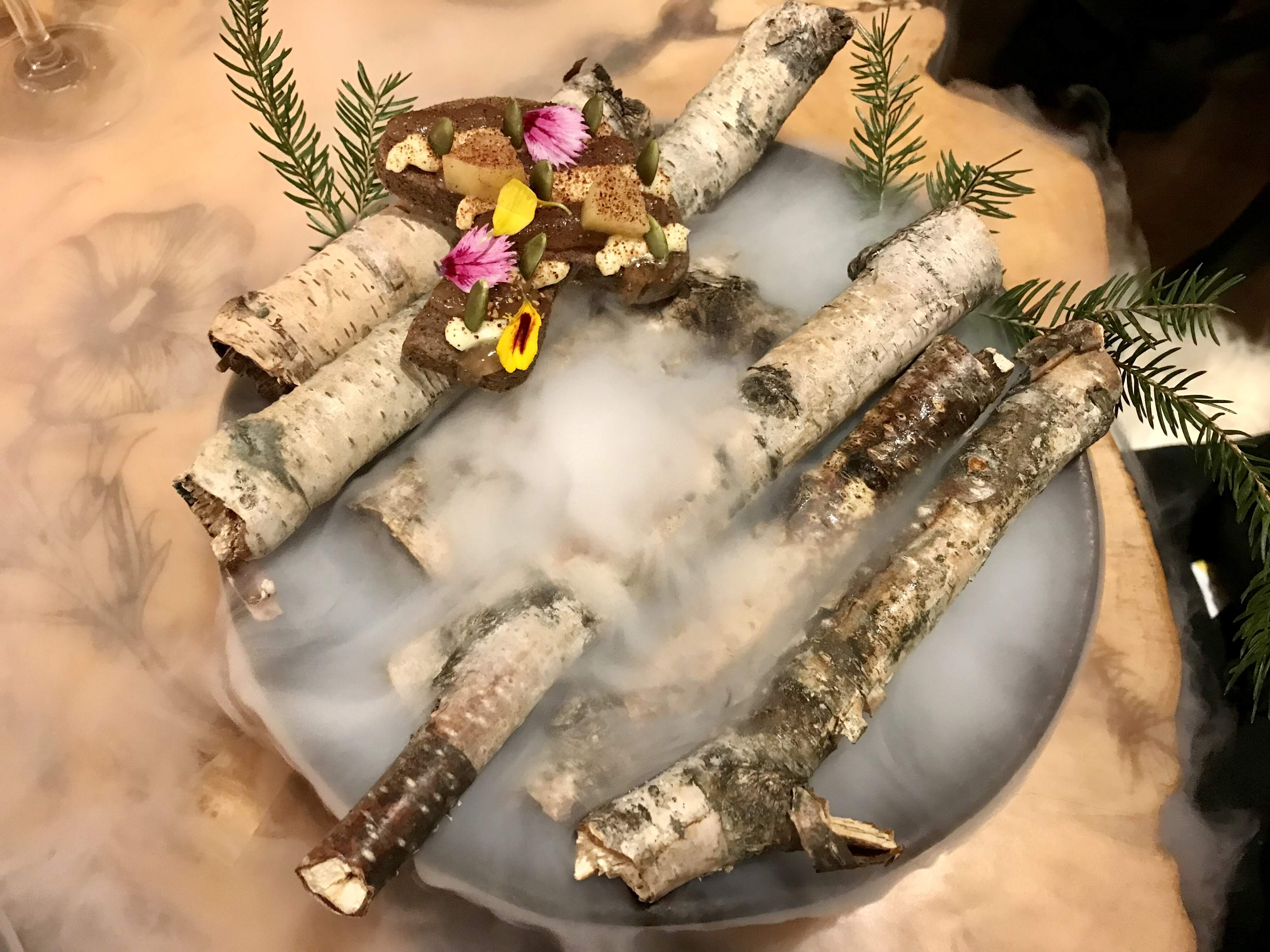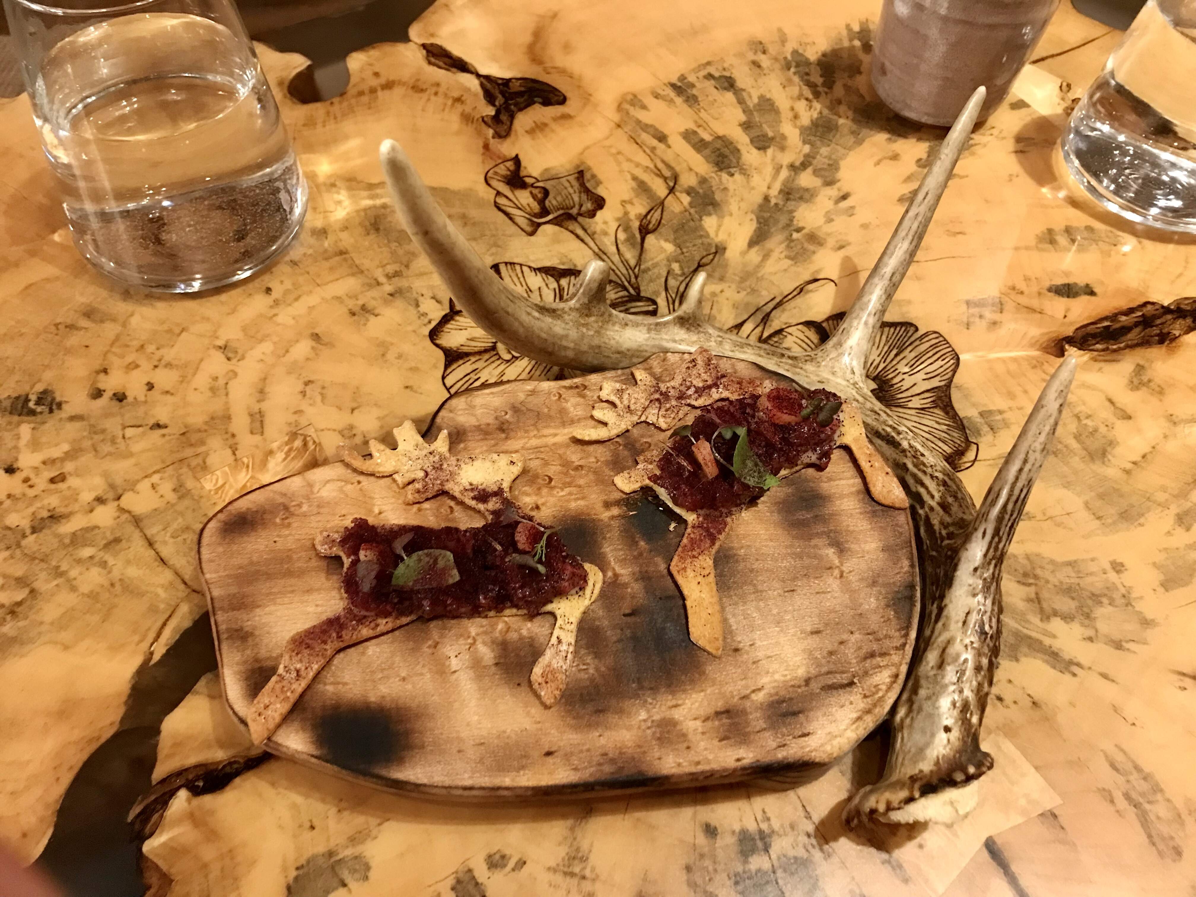 - Venison tartare was accented with an emulsion of spruce vinegar, pickled carrots, chive blossoms, watercress, mustard greens, and beetroot powder, and served on top of a cute deer-shaped cracker made out of harvested yellow oyster mushroom – the subtle bitters and sours complemented the heartiness of the meat. This was served on a slab of wood, rimmed by a deer antler.