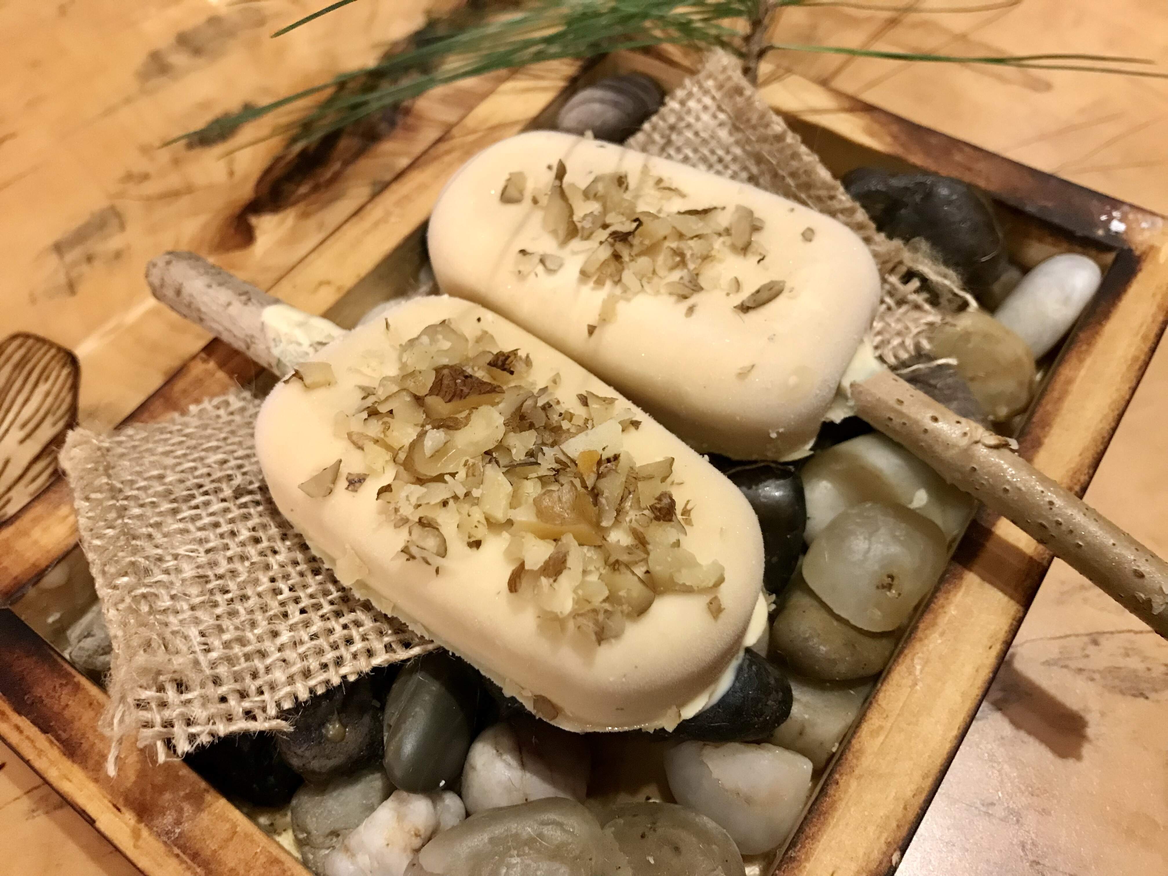 Dessert started off with popsicles of burnt paper birch bark ice cream, accented with maple and birch syrups, and coated with some toasted black walnuts on a whittled twig – creamy, lightly sweet, with that complex umami-ish hint from the birch.