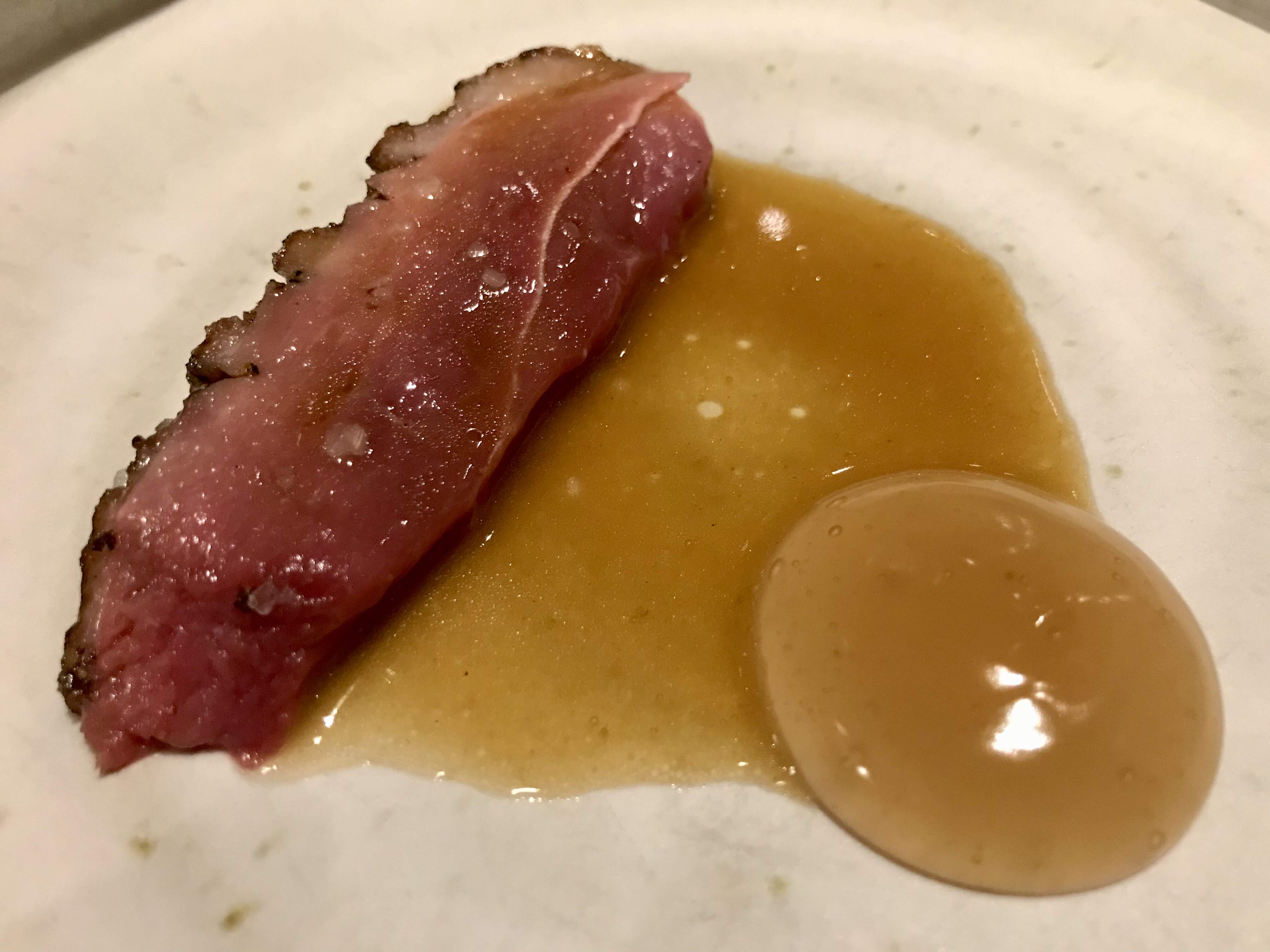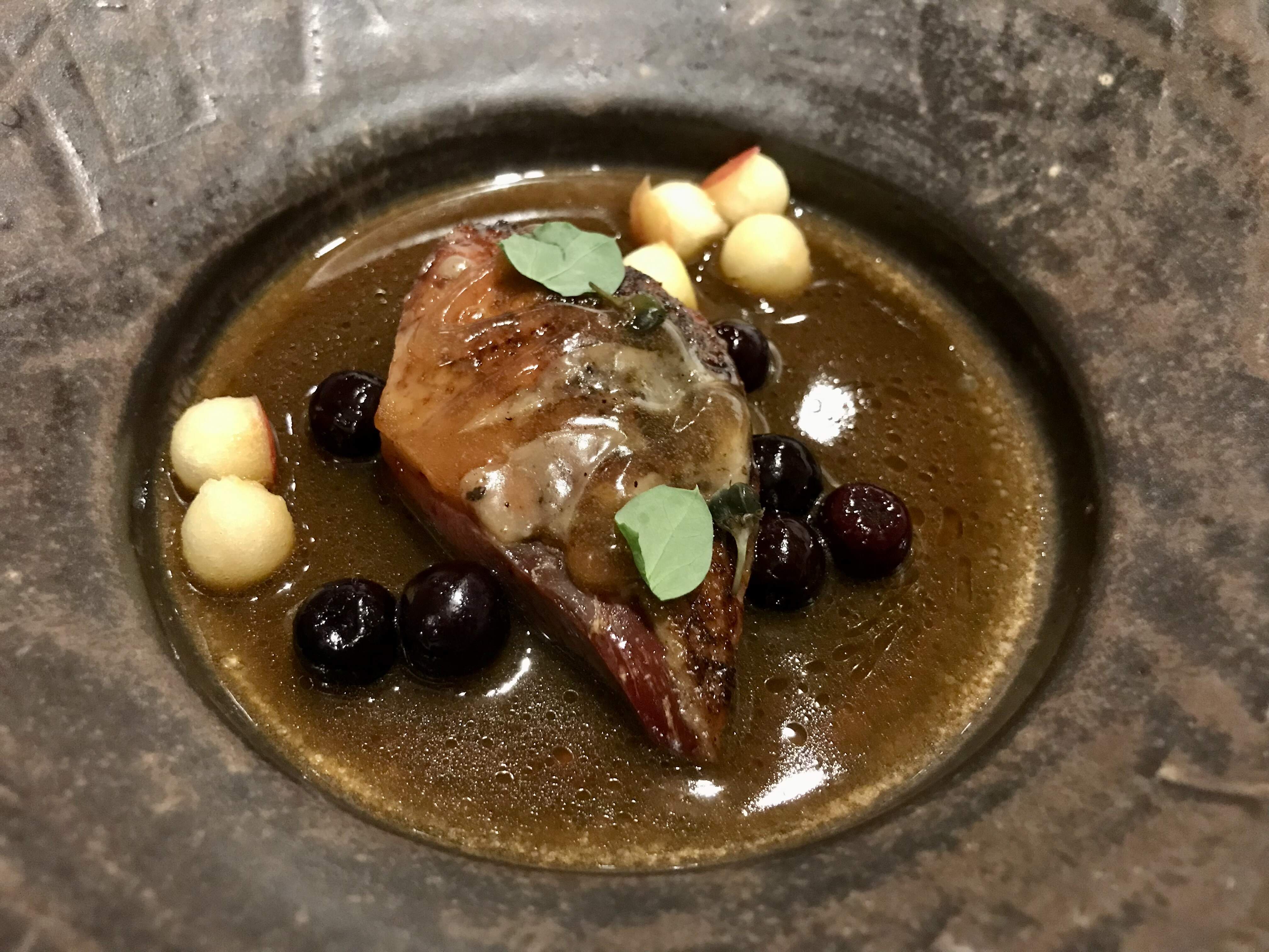 Our fourth pairing was a mix of aroniaberry (chokeberry) and beet vinegar. This was a bit like lemonade, with the beets adding a pleasant earthiness. Chef Zach then came around with pigeon breasts, grilled over charcoal, with maple and magnolia vinegar glaze, blackened apple gel, and pickled onion seeds. We were then served a slice of moist breast, with pickled chokeberries, fresh tart apple spheres, and a silky bone jus with white pine oil (but no spoon or bread to pick up the last bits).