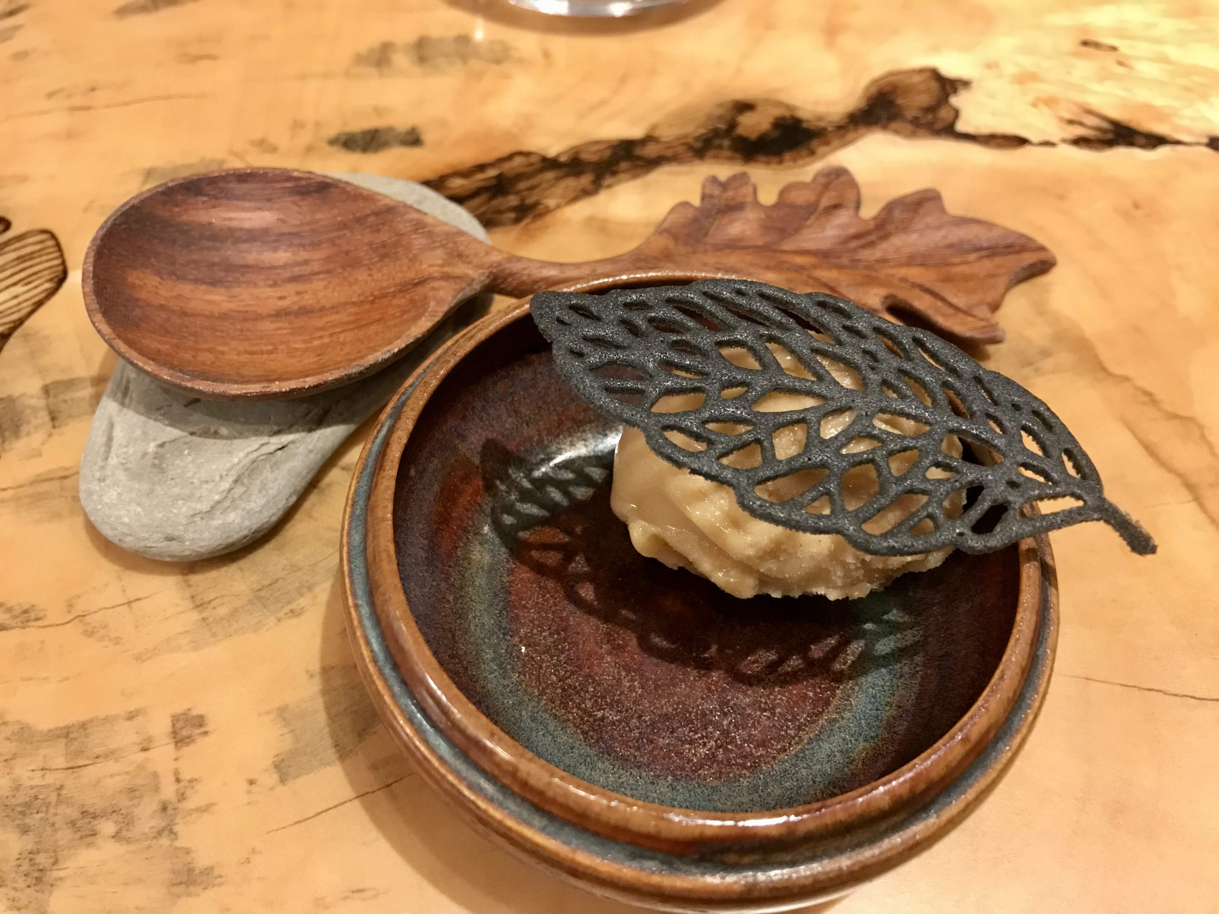 Our third pairing was apple juice and cantaloupe vinegar, which was nicely balanced and not overly acidic. We were then given wooden spoons with oak leaf handle and a palate cleanser of paw-paw sorbet, lightly inflected with wild rhubarb vinegar and topped with a lacy leaf tuile made from activated charcoal. We love paw-paw, so this was a hit.