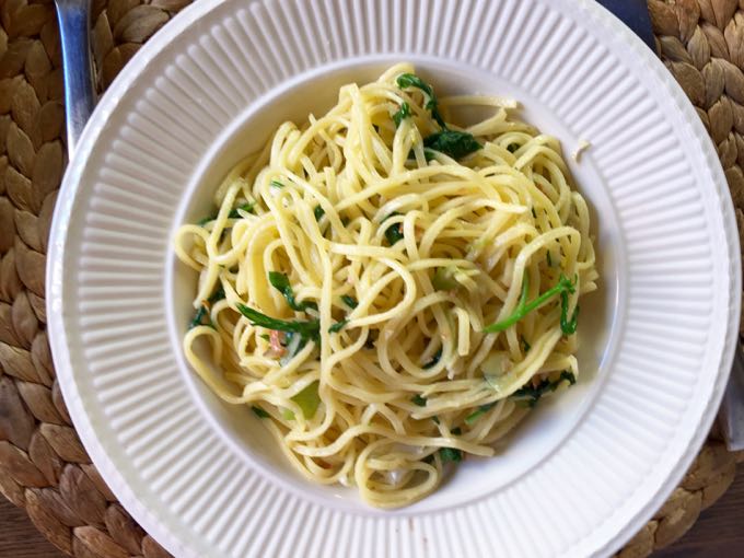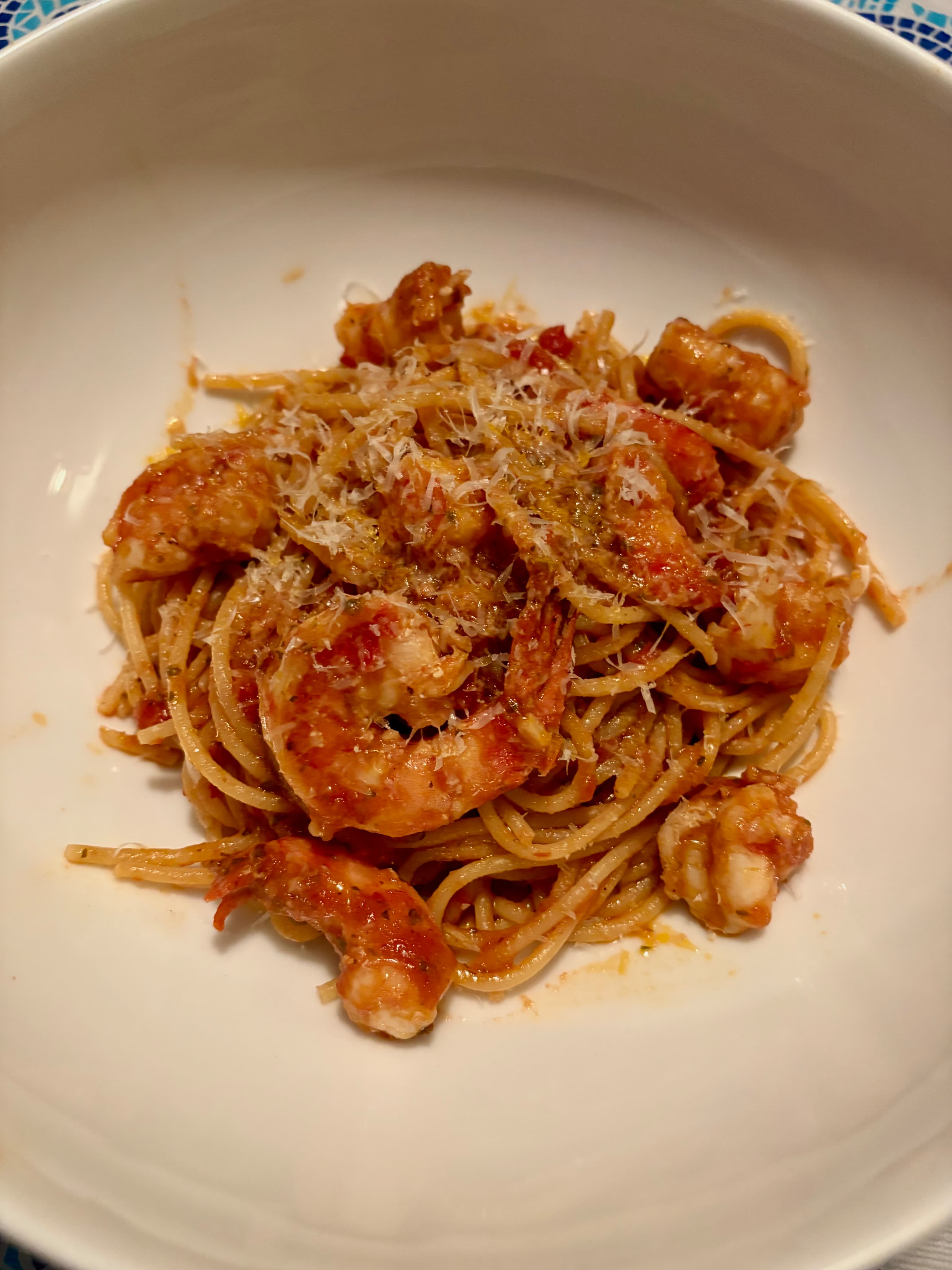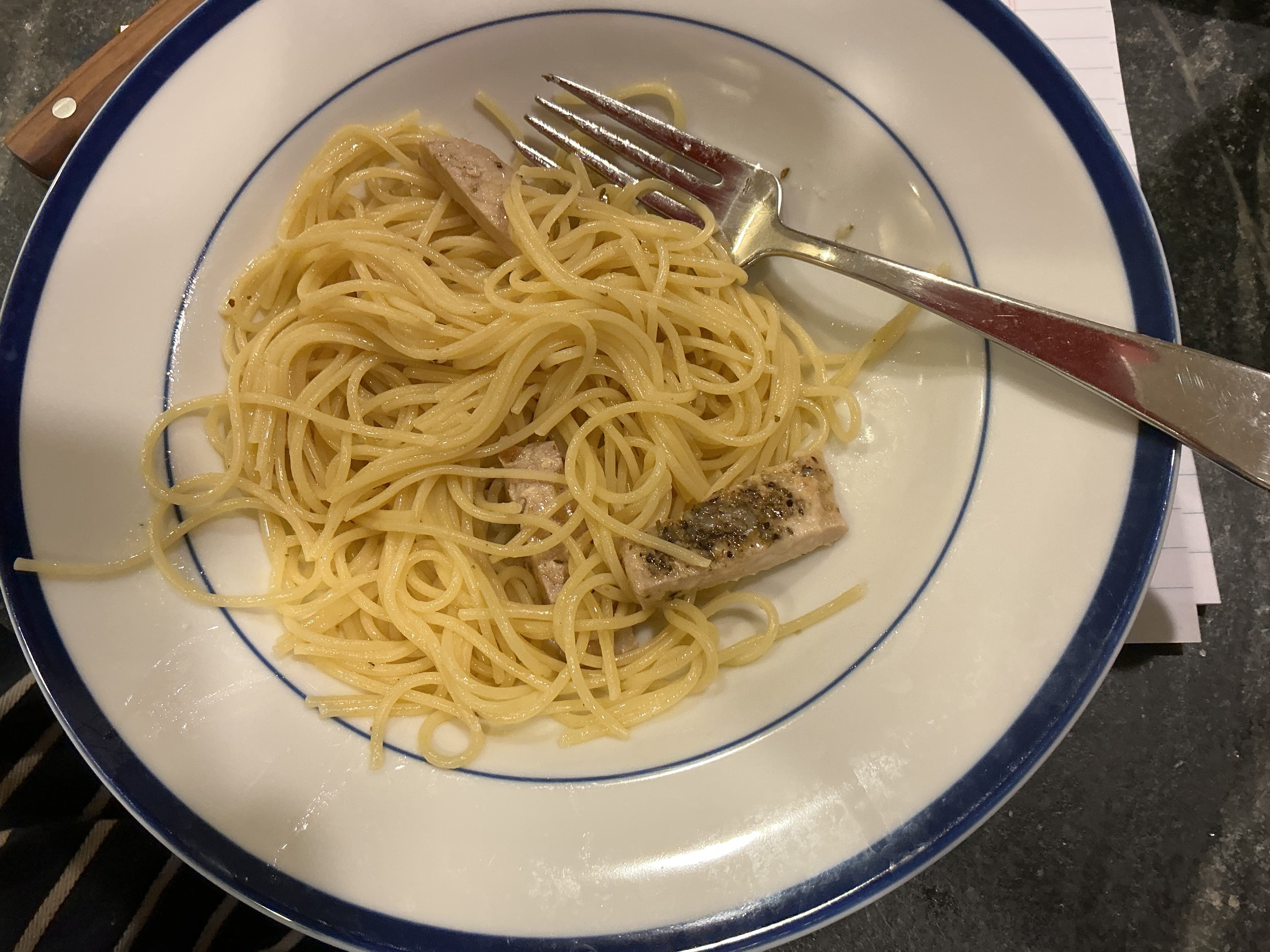 Last night we were working on clearing the freezer and the pantry for Thursday. Two small, boneless pork chops were pan fried in olive oil and some Adams cacio e pepe dipping mix. They were sliced into bites and tossed with pasta somewhere between capellini and spaghetti with olive oil, butter, and grated Parmigiana Reggiano. The accompanying salad was Coco Larkin’s California Thanksgiving salad: thinly sliced fennel, sectioned orange, olive oil and Champagne vinegar dressing, pomegranate seeds, Castelvetrano olives, and, instead of Coco’s pistachios, roasted pumpkin seeds.