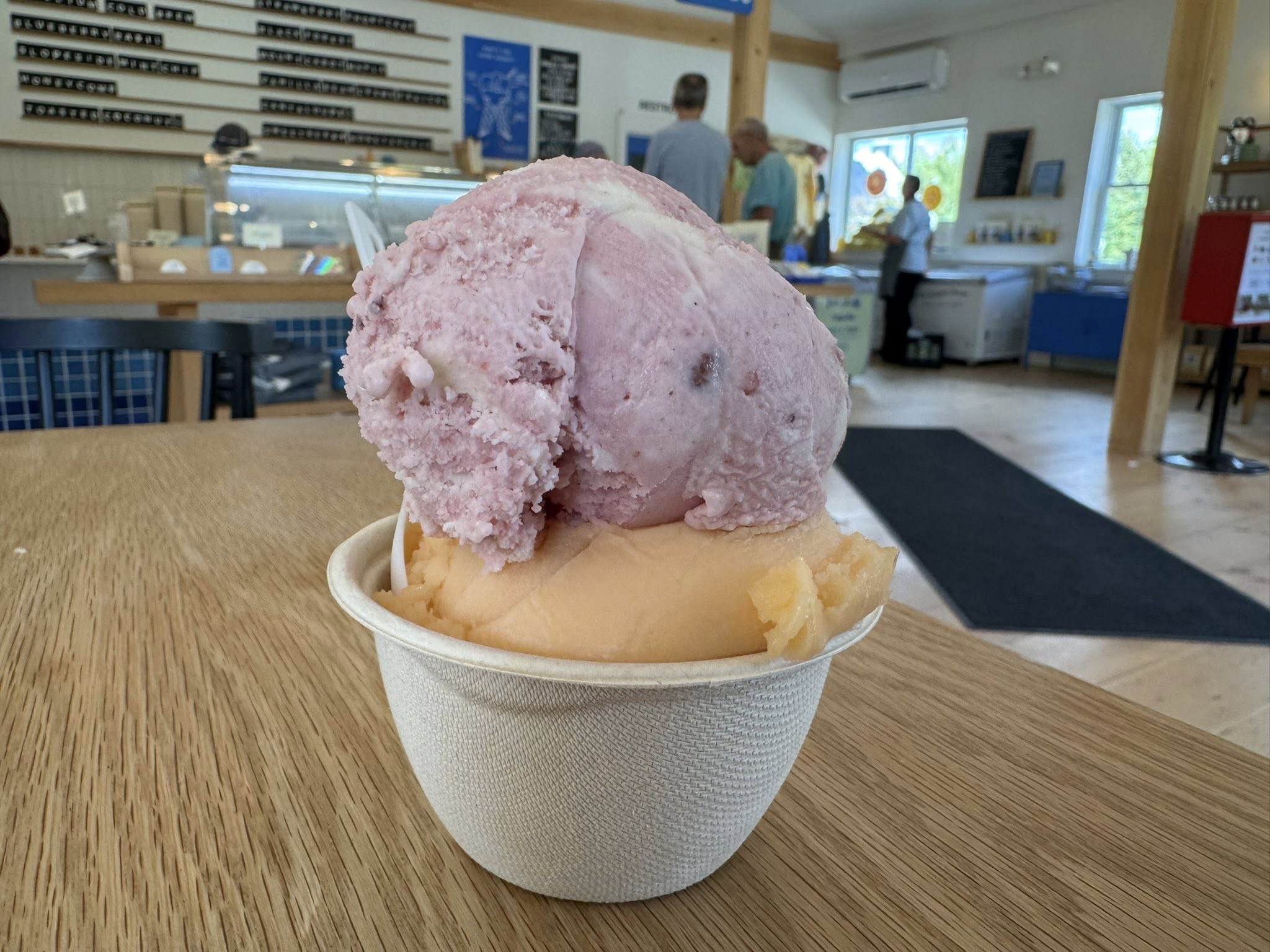 My cup of Strawberry Shortcake and Cantaloupe Sorbet. The strawberry one has crunchy bits like the Good Humor bars were coated in—“strawberry milk crumb with sumac,” per their Facebook page. The sumac (which I love) is barely perceptible, but it’s a great ice cream.