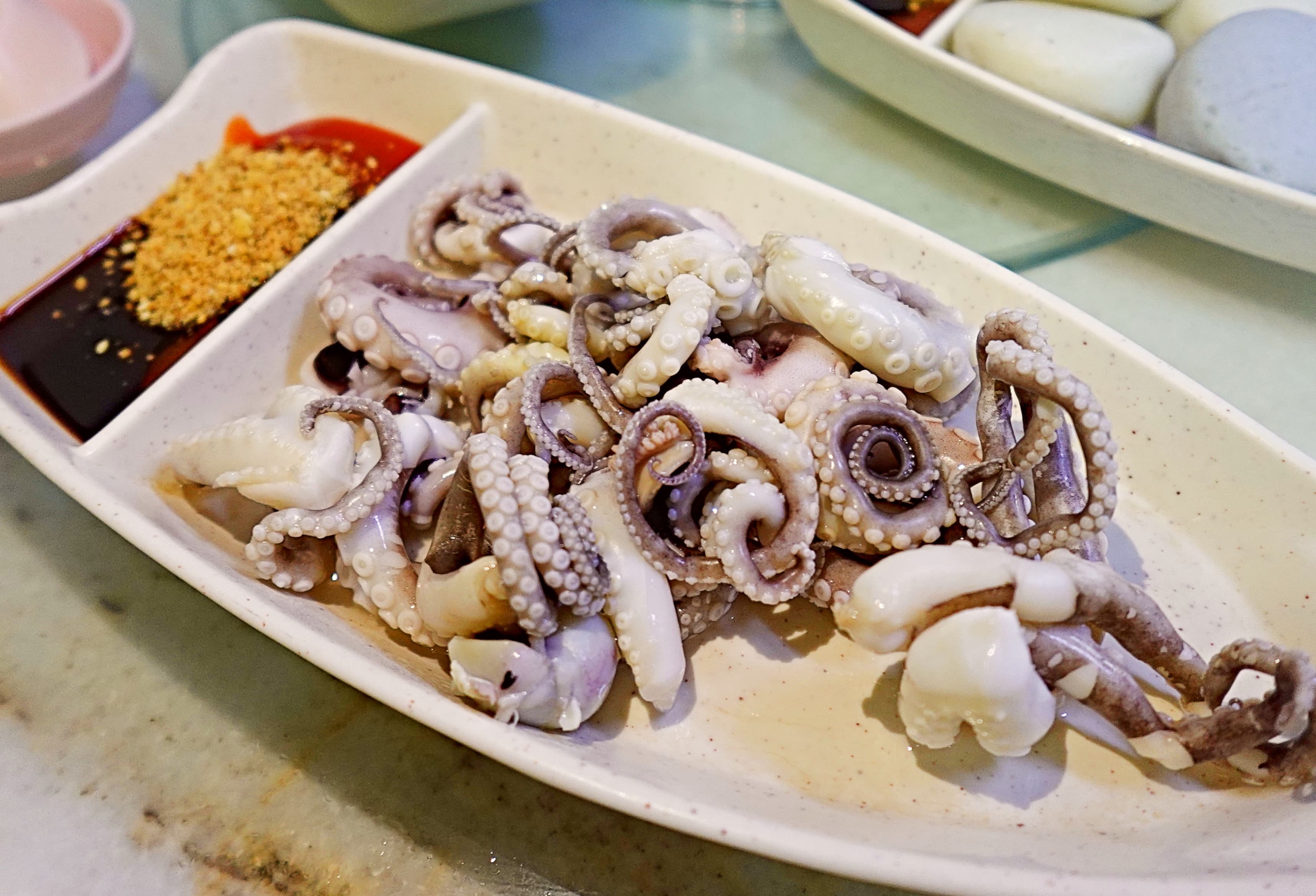- Squiggly octopus tentacles, boiled to perfection here and served with an addictive dip of chili sauce and hoi sin sauce, topped with crushed peanuts.