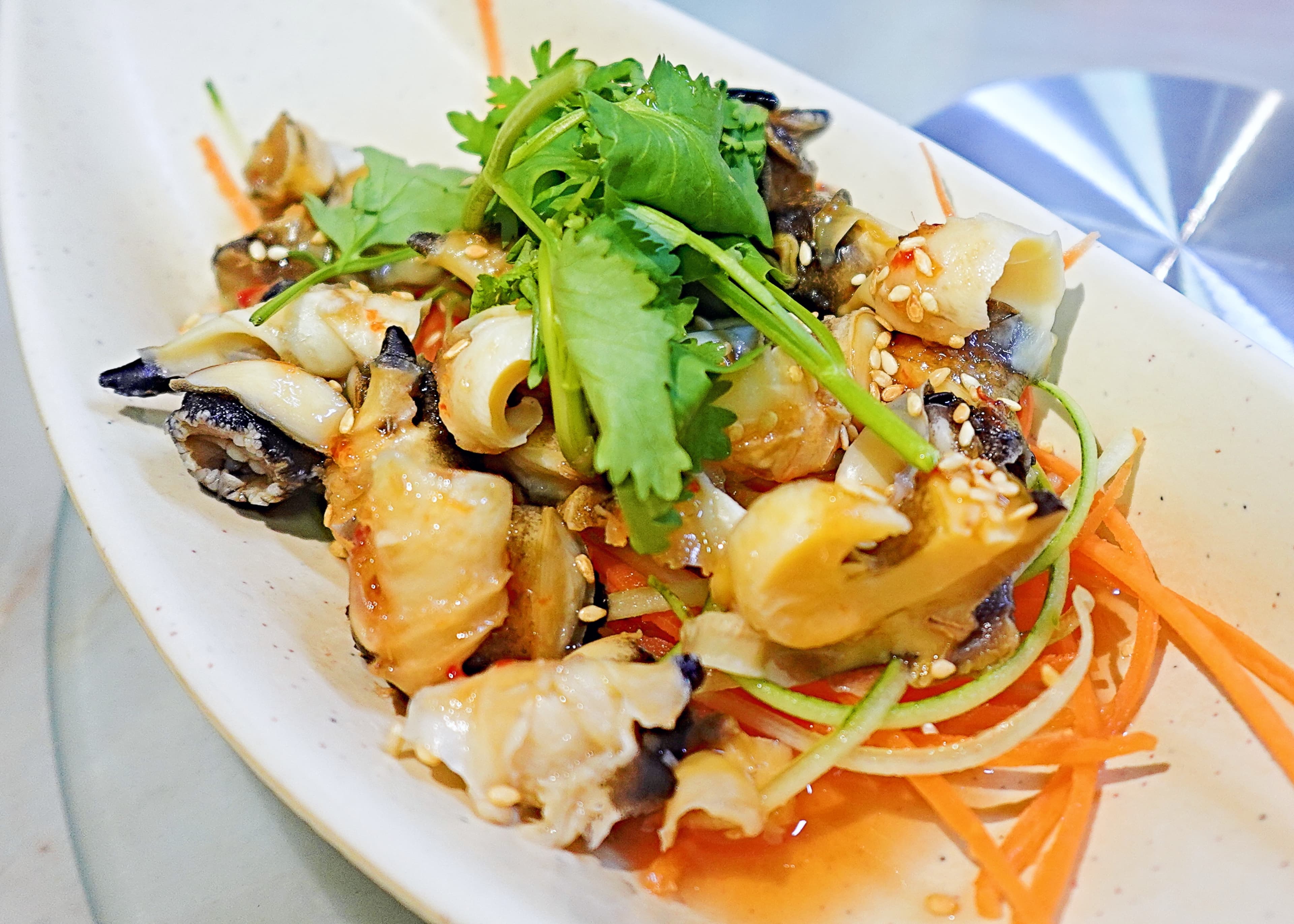 Conch-meat in Thai sauce - the Chinese really like various types of textures in their food. The thinly-sliced conch here has a very pronounced rubbery, chewy texture. Dressed in a spicy-sour-sweet Thai dressing, itโs delicious, but one has to have the patience to chew โฆ and chew.