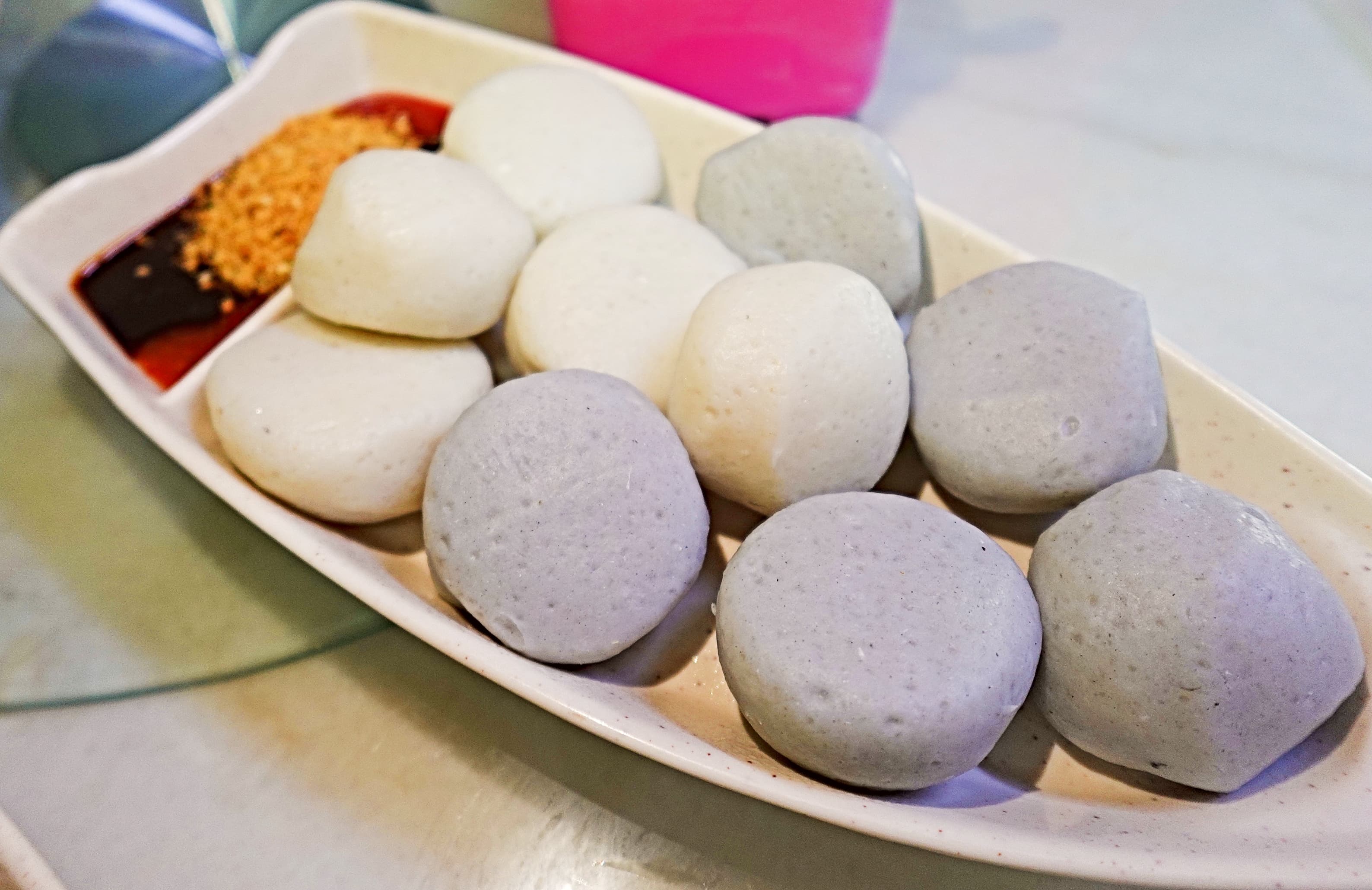 Wolf herring fish balls, which had a slide shade of lavender, and the white eel-meat fish balls. These are springy Teochew/Chaozhou-style fish-balls, where raw fish forcemeat, carefully scraped from the bones are formed into ping pong ball-sized spheres. These were boiled and served with the same chili sauce/hoi sin sauce/crushed peanut dip as for the octopus.