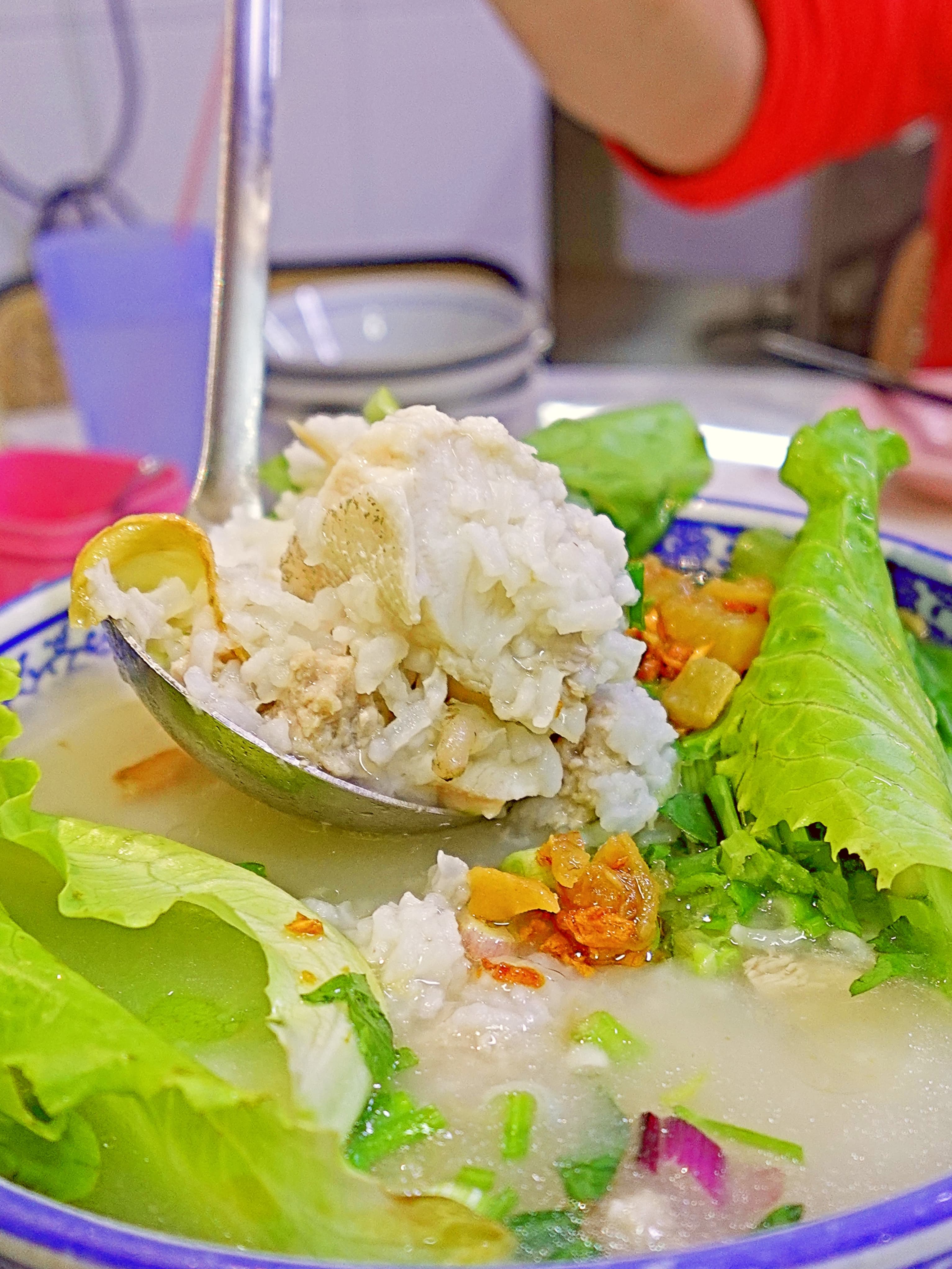 The version here was breathtakingly flavorsome - the fish broth having been obtained from hours of boiling down fish-bones, pork bones, dried scallops, ginger, and other โsecretโ aromatics. Chunks of cooked fresh seabass and rice were steeped in the tasty broth, which is garnished with fresh lettuce leaves, chopped spring onions and golden, deep-fried pork lardons and crisped-fried garlic crumbs.
