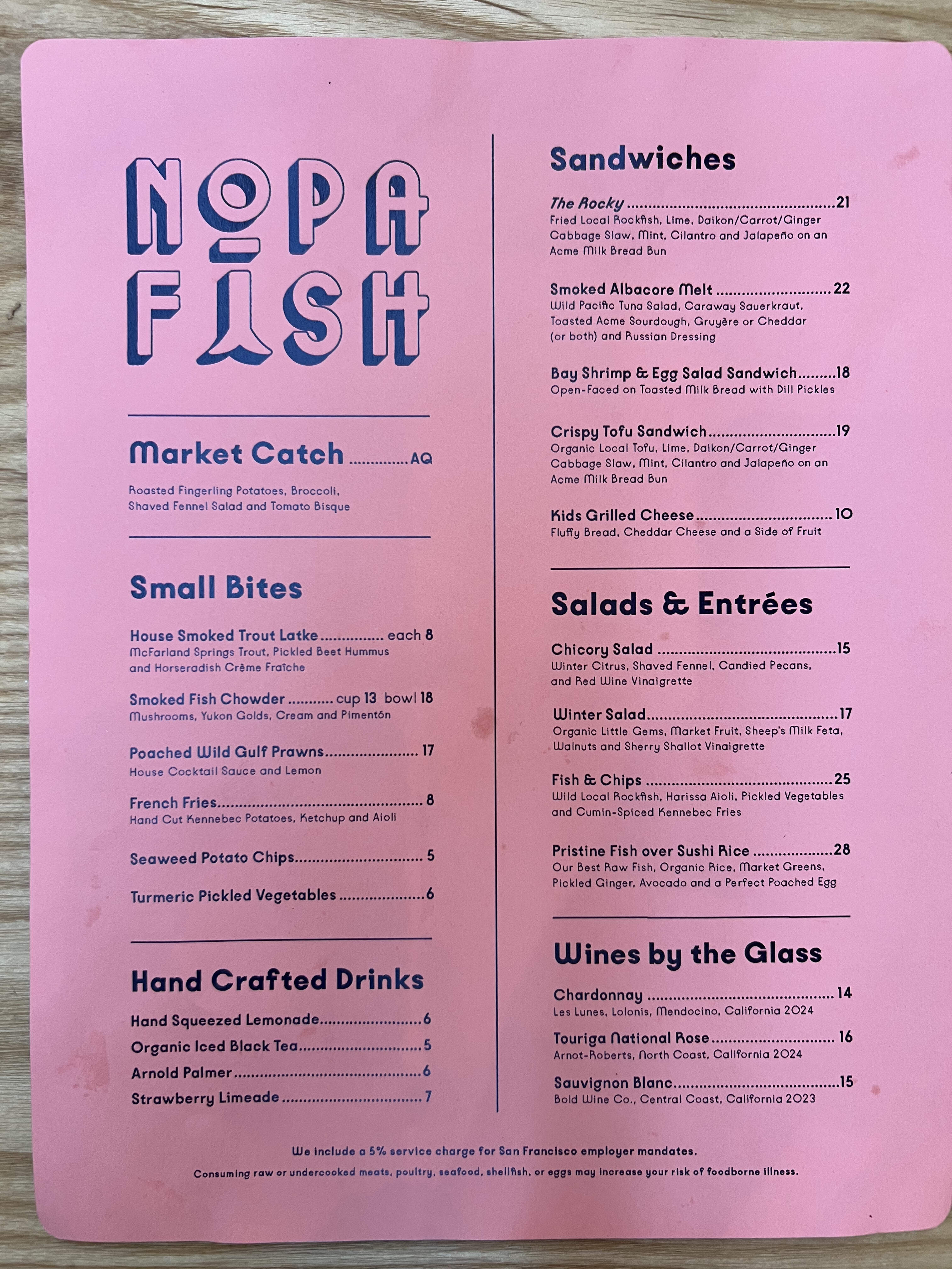 Yesterday I had lunch at the somewhat recently opened (June 2025) Nopa Fish in the Ferry Building. Nopa Fish is a casual restaurant and seafood market from chef Laurence Jossel who also runs Nopa on Divisidero in NoPa.