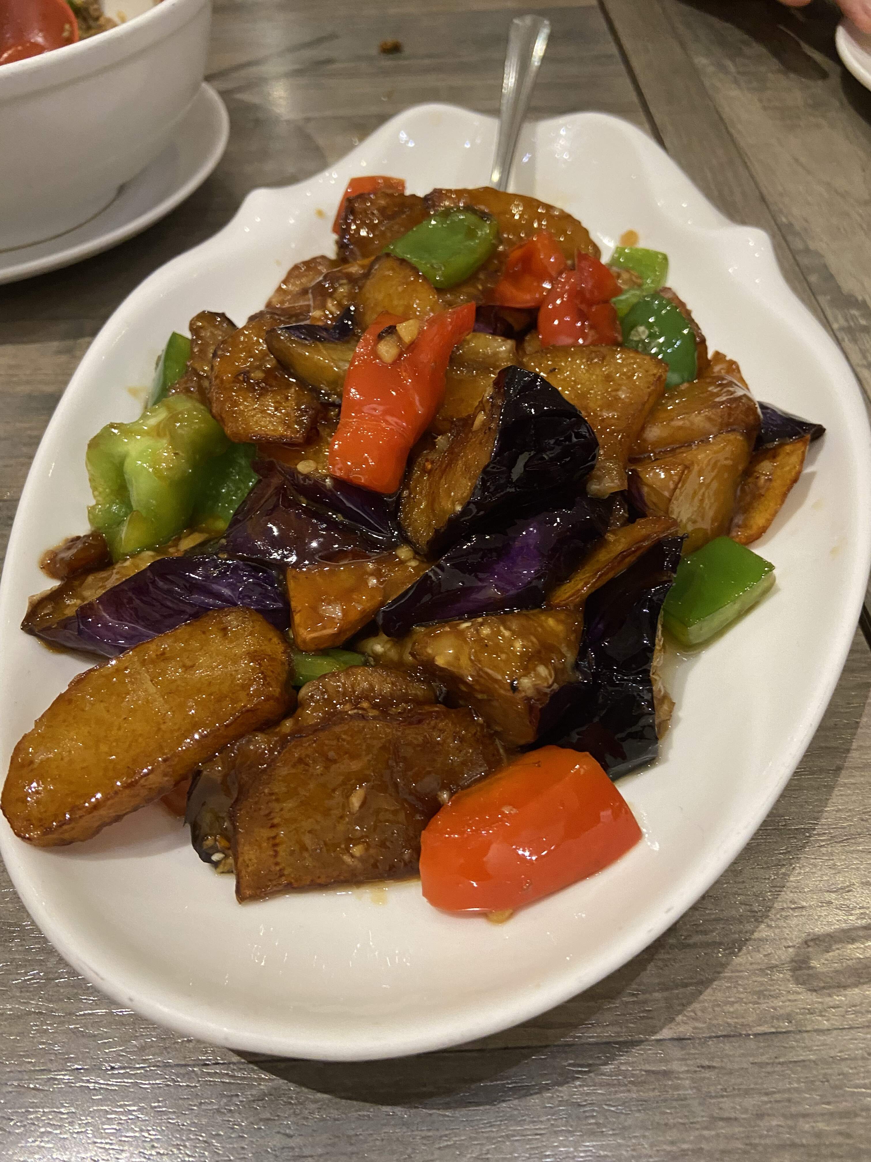 Stir fried ‘Chinese Ratatouille‘ of fried potato chunks, green peppers and eggplants! ( wok-fried with Brown sauce instead of stewed with a tomato based sauce! )