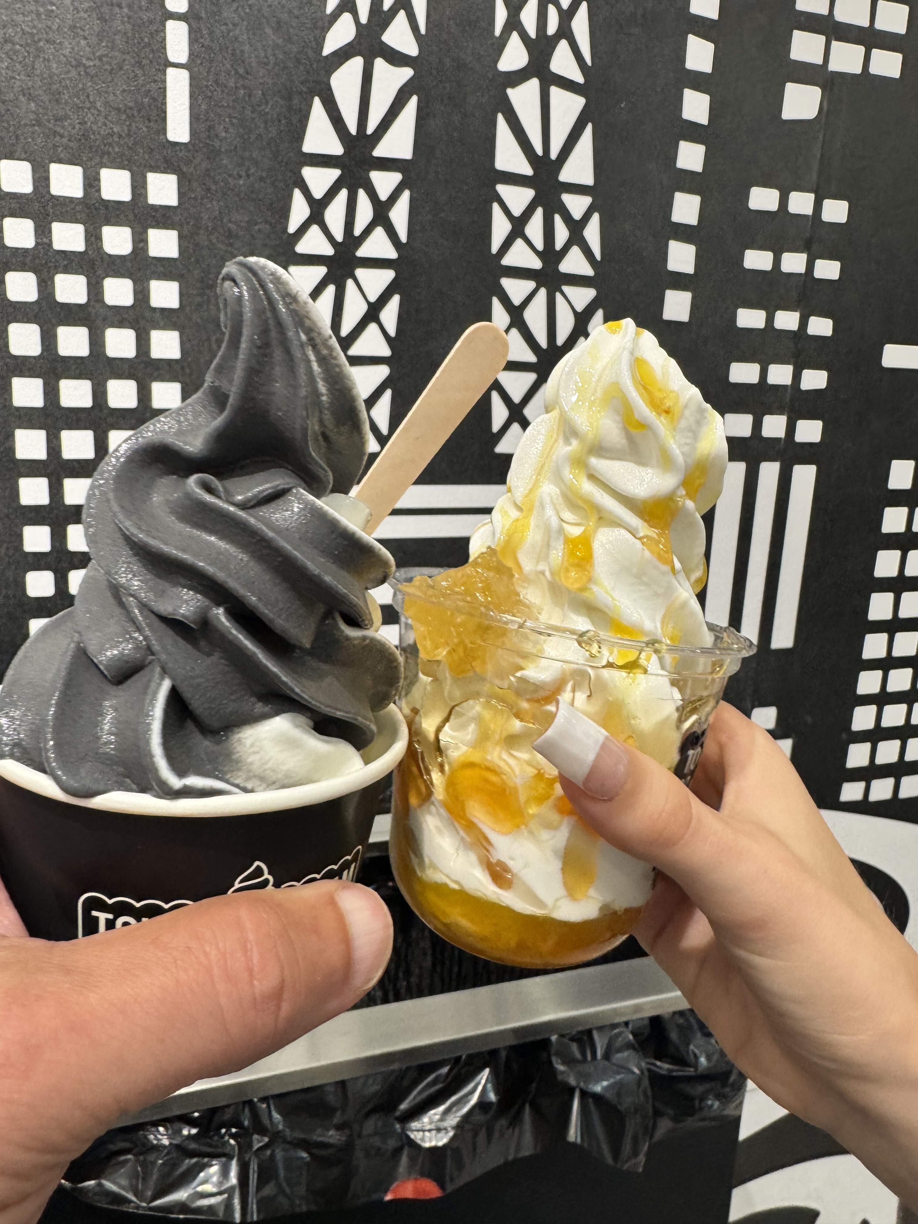 They use Hokkaido cream for their soft serve. Hokkaido milk sesame swirl and Hokkaido milk with yuzu and honey. Really good stuff.