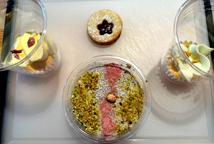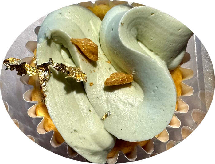 Clockwise from midnight, pistachio linzer, pistachio-raspberry cupcake, kheer chia pudding, and saffron-passionfruit cake. Here’s a closeup of the very pretty, gold-leaf bedecked pistachio-raspberry cupcake: