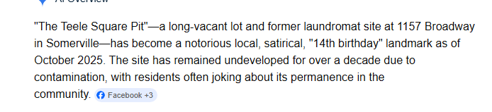 The included snippet states that there used to be a laundromat where the Teele Pit is but my recollection is that it was a dry cleaners - which is why it was so contaminated