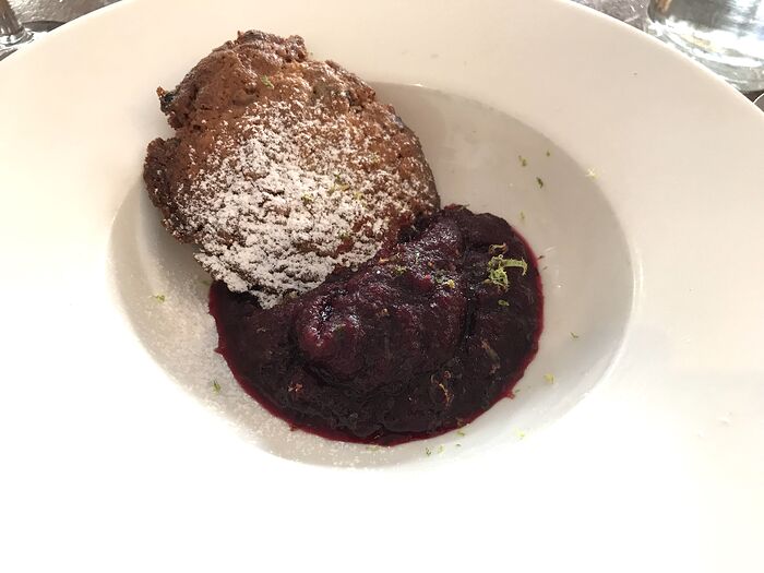 Dessert: Crème de betteraves rouges & cookie aux noix de pécan - Beetroot cream and pecan cookie. A bit of a disappointment, I would say it was a basic beetroot purée (not too smooth) and an okay cookie. Nothing very special, and the beetroot tasted very much like it was. I think a touch of acidity like raspberry vinegar would be a plus.