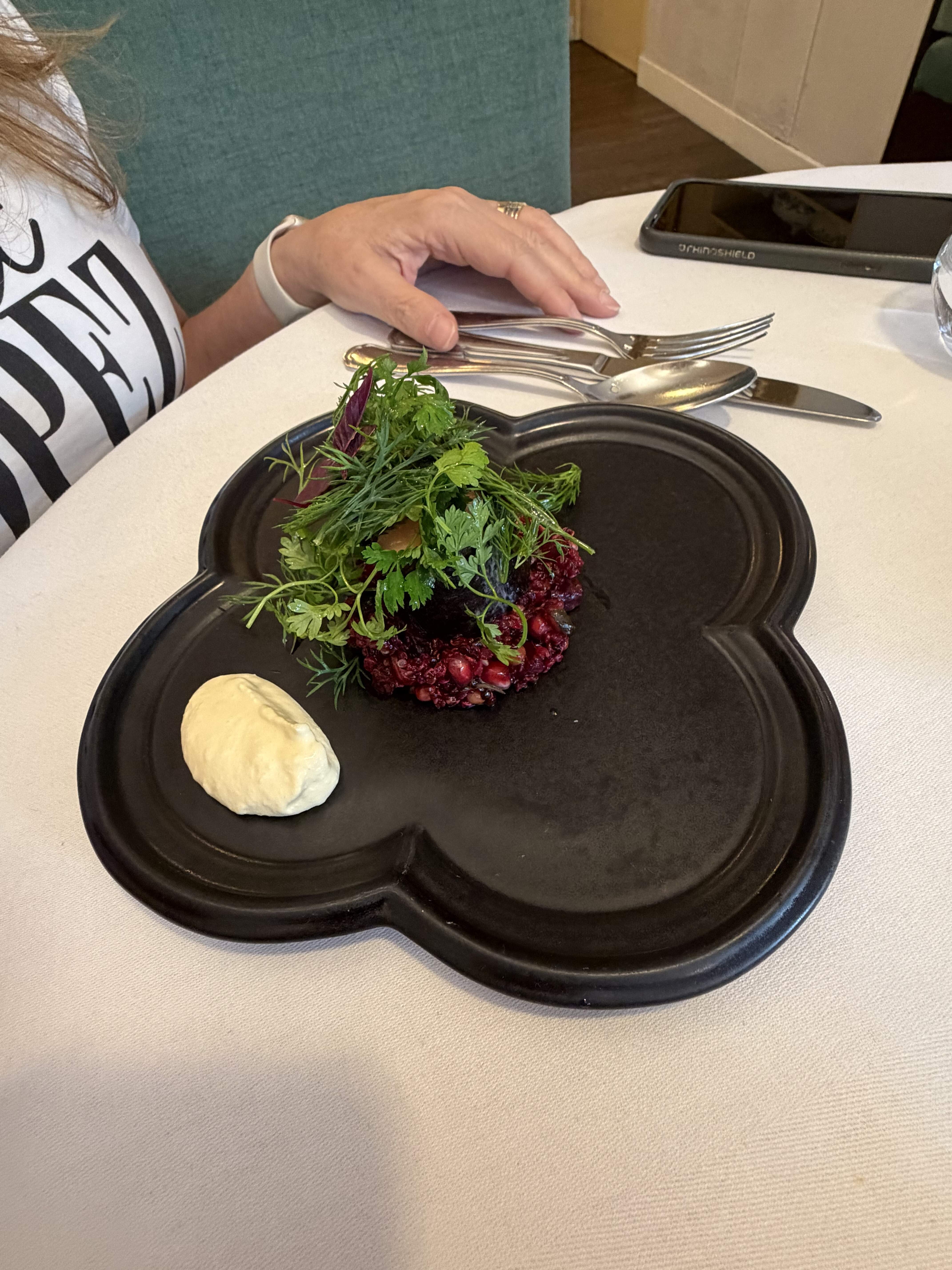 The salmon confit on top of beets, quinoa and pomegranate seeds with a raifort cream looked spectacular, but was somewhat less impressive tasting.