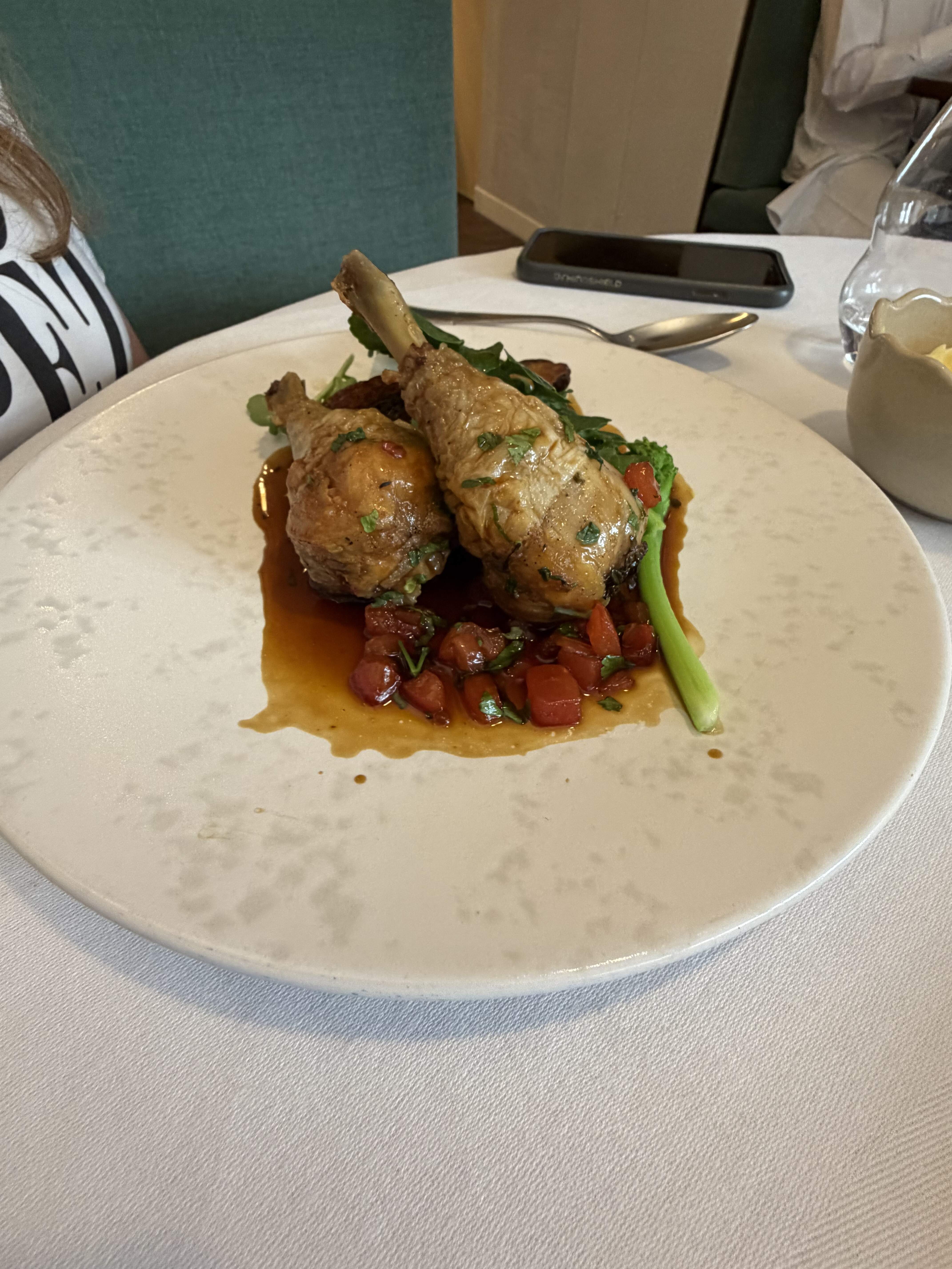 My wife’s chicken drumsticks with an excellent Lambrusco vinegar jus, with a caramelized Roscoff onion plus a potato purée (unpictured) were the highlight of the meal, alone worth going back for.
