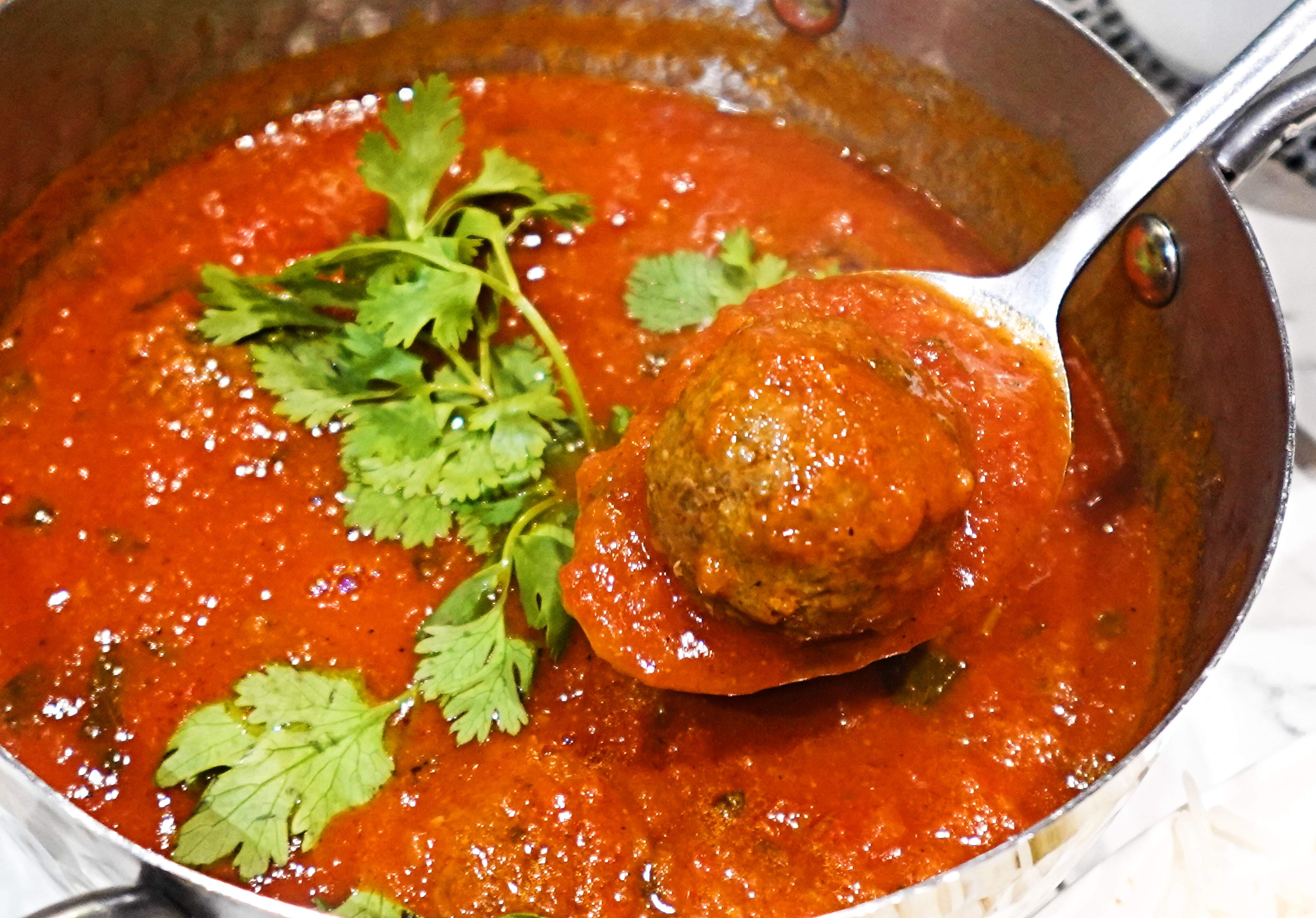 Dawood Basha - a Levantine classic of tender, spiced lamb meatballs simmered in a rich, aromatic tomato sauce, seasoned with cumin, coriander, cinnamon, and paprika. Served with pita bread.