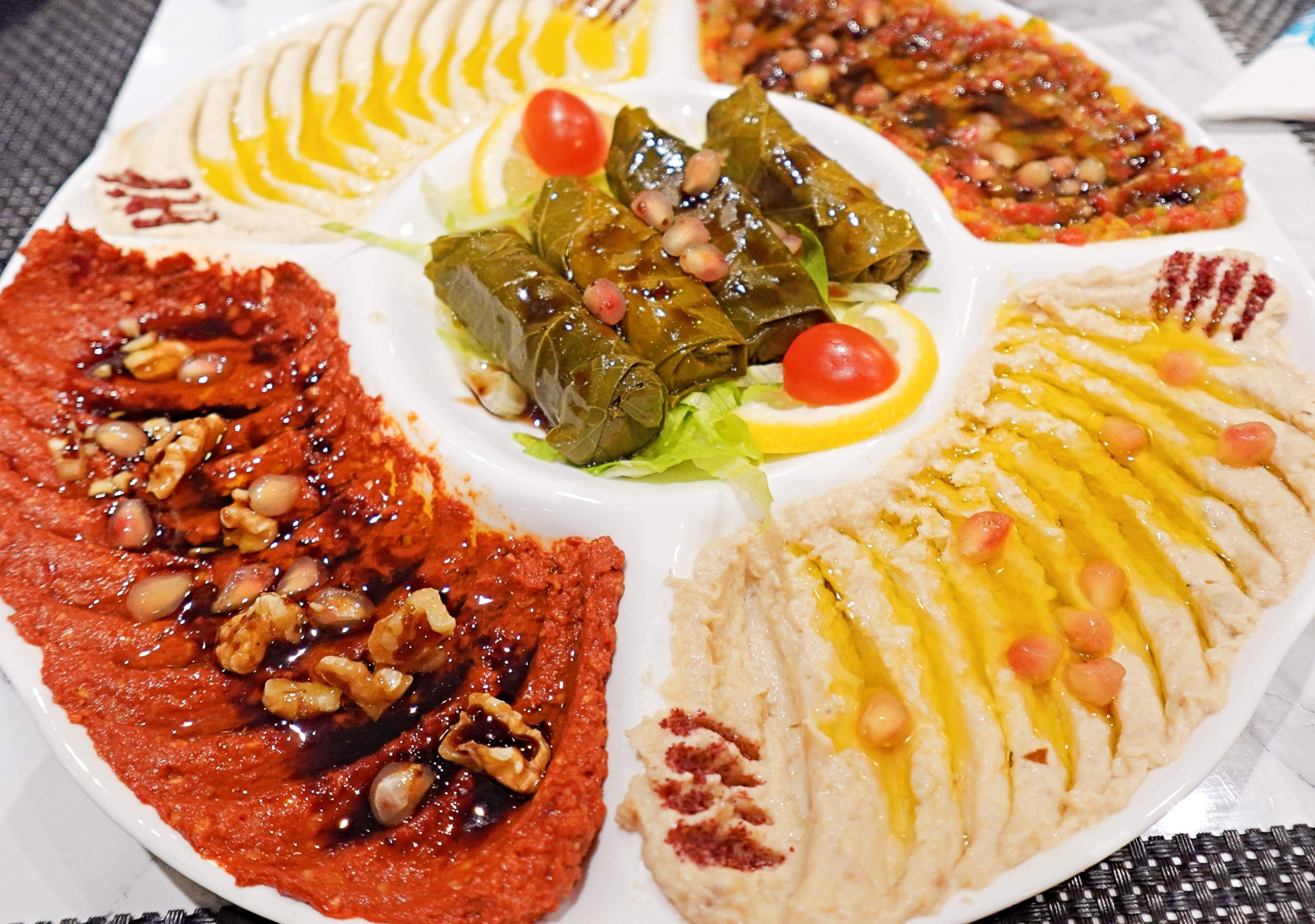 Appetiser platter (clockwise from top-left): Baba Ghanoush (roasted eggplant), Moutabal (tahini, roasted eggplant, garlic, yoghurt), Muhammarah (red bell peppers, pomegranate molasses, walnuts), Hummus (chickpeas, tahini), and centre: Warak Enab (grape leaf rolls with rice-lemon juice stuffing.
