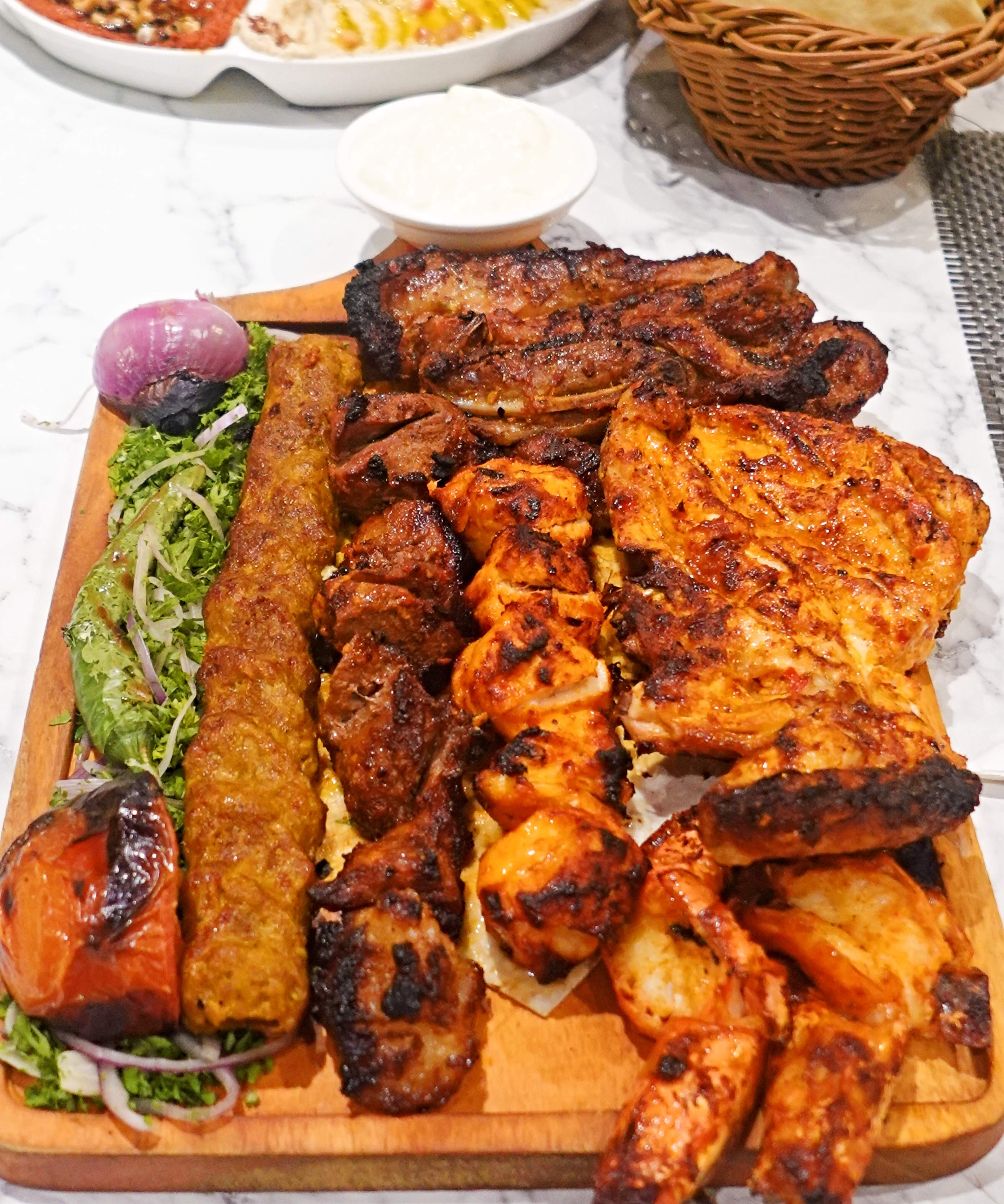 Mixed grill, consisting of (left to right): Kafta (minced lamb with parsley, onion, spices), Lahem Meshwi (grilled lamb cubes), Shish Taouk (marinated chicken skewers), and Djej Mishwi (grilled chicken chops). Top: Kastaleta (grilled lamb chops) and bottom: Rubiyan Meshwi (grilled prawns). Served with Toum (creamy garlic dip).
