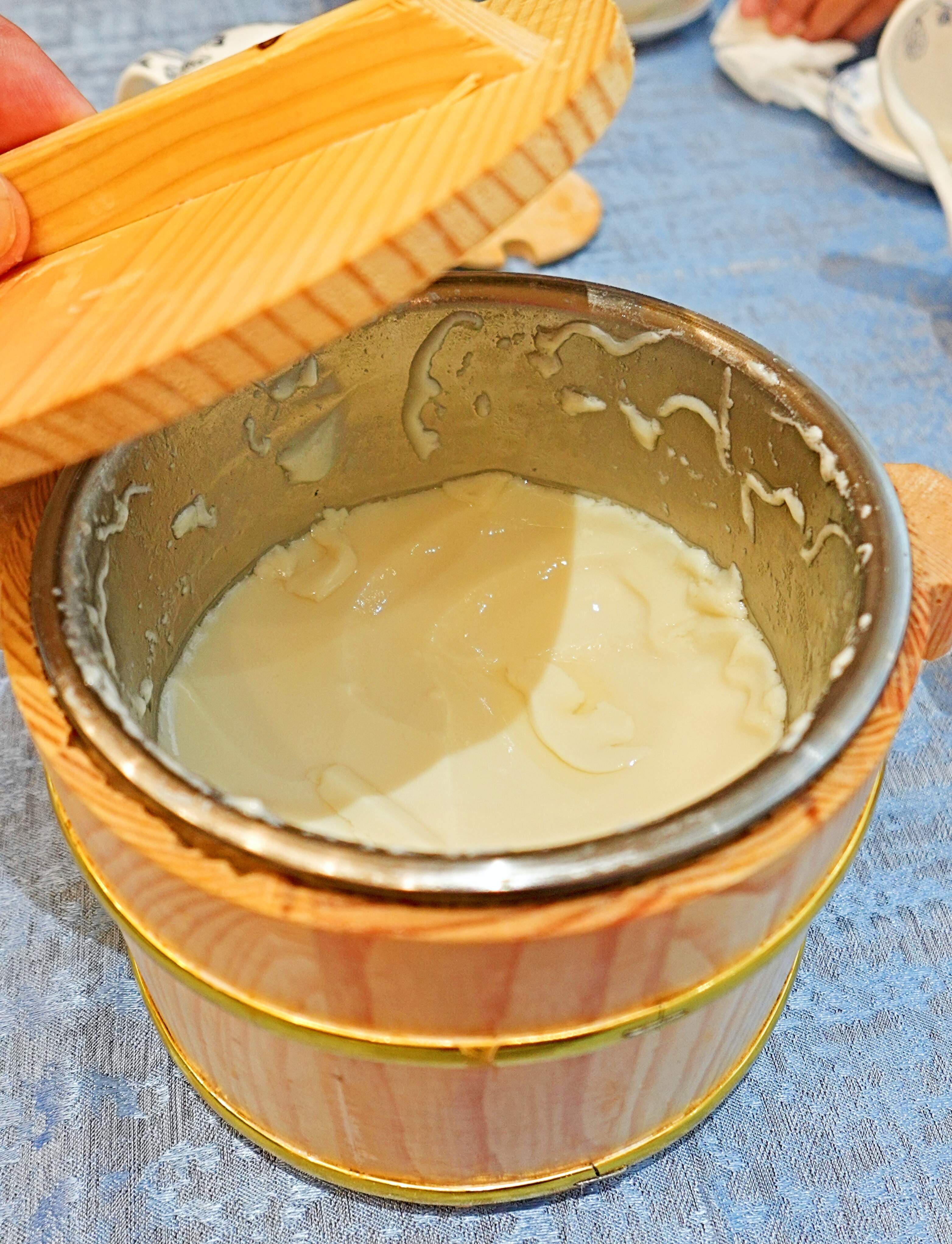 ๐๐ฐ๐ถ๐ฉ๐ถ๐ข (soybean curd) dessert - served warm from a wooden barrel. The junket pudding is served with either a delicate, floral-scented sugar syrup, or brown sugar granules.