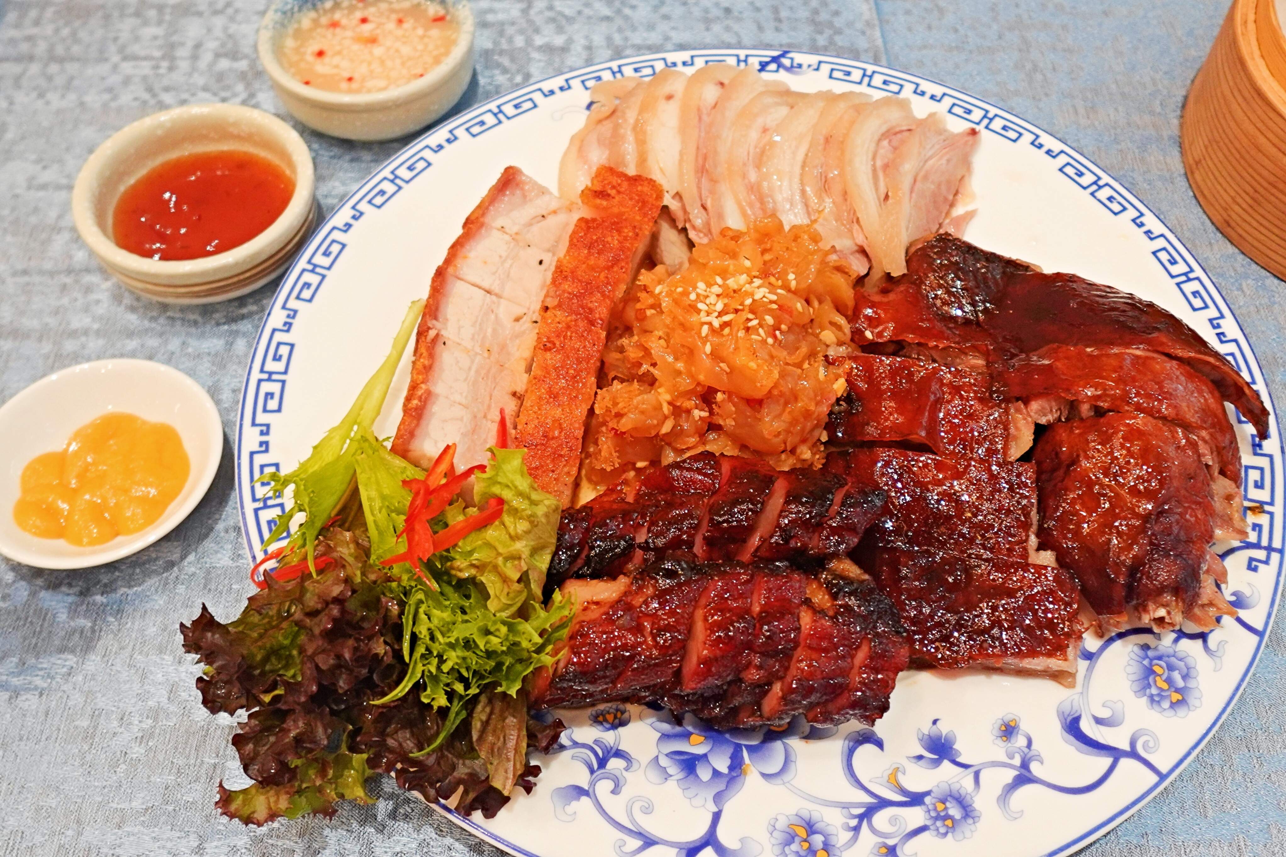 Mixed meats platter, consisting of ๐ค๐ฉ๐ข๐ณ ๐ด๐ช๐ฆ๐ธ (Cantonese-style caramelised BBQ pork), ๐ด๐ช๐ฆ๐ธ ๐บ๐ฐ๐ฌ๐ฆ (crackling-skinned roast pork), spiced jelly-fish, cold pork roll, and ๐ด๐ช๐ฆ๐ธ ๐ฏ๐จ๐ฐ (Cantonese-style roast goose).