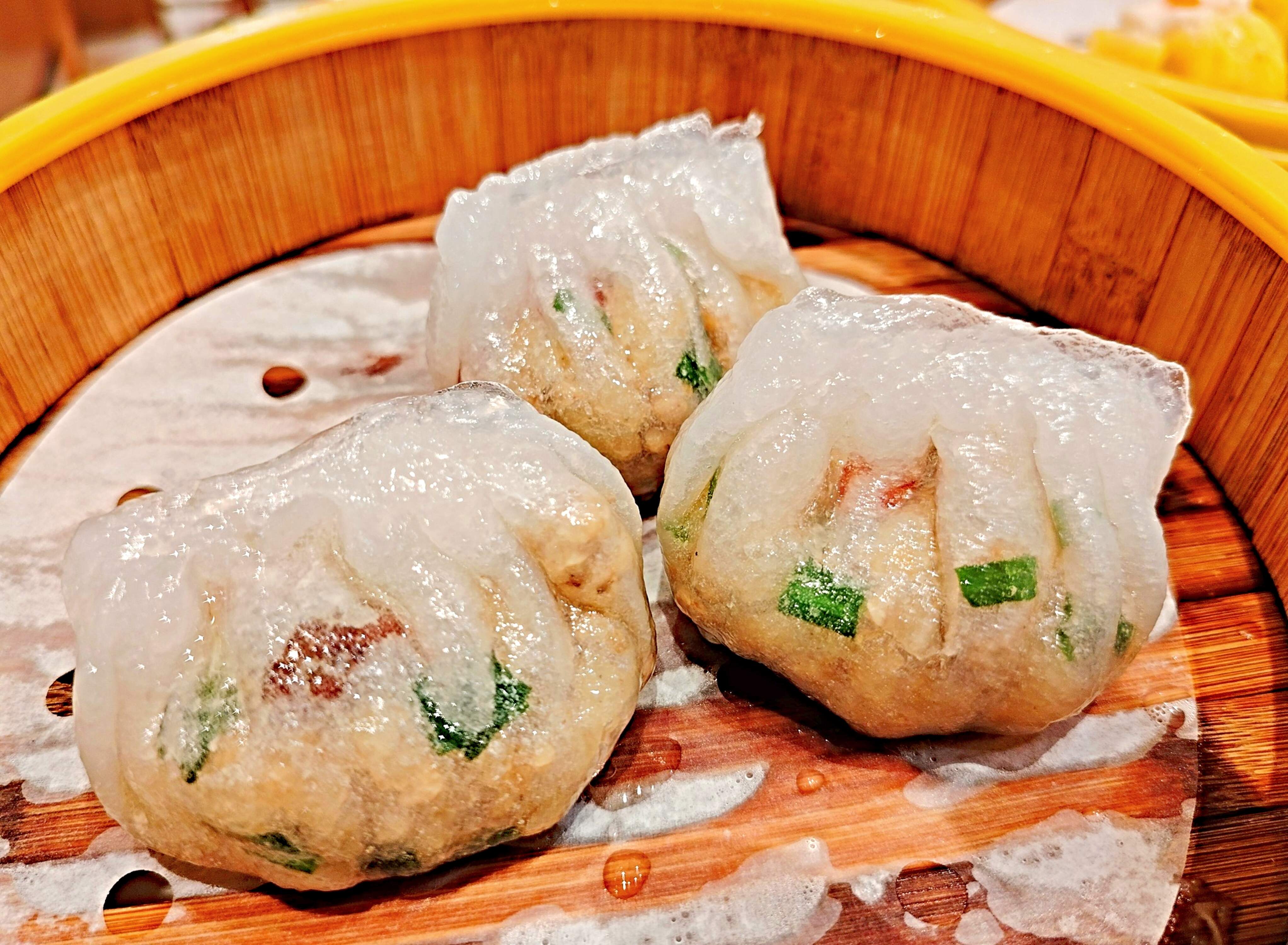 Chiuchow fun guo - steamed Teochew dumplings, with minced pork, peanuts, garlic chives, jicama (yam bean), dried shrimp, and shiitake mushrooms filling.