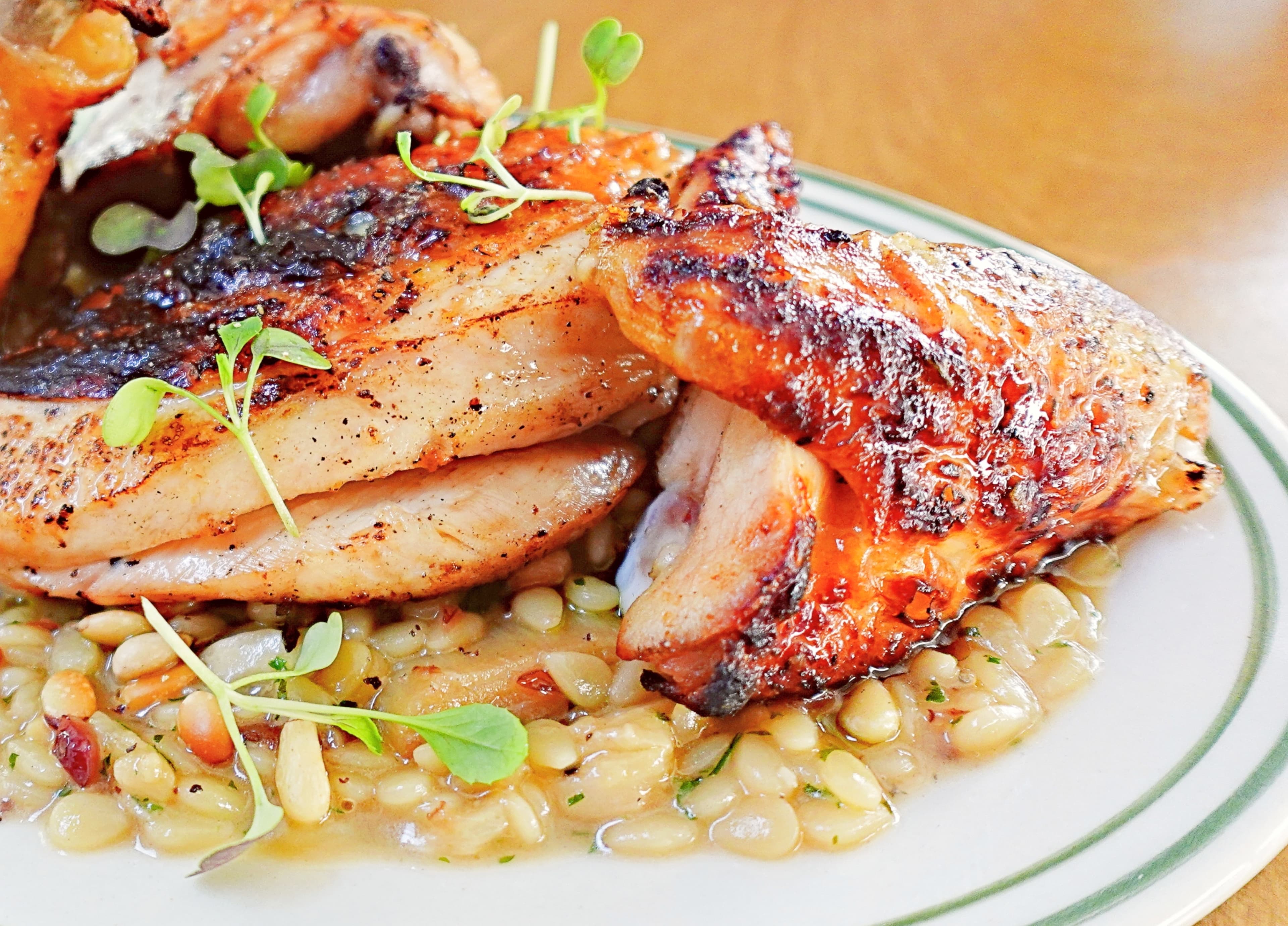 Charred cabbage, cashew cream, caper-sultana butter, walnuts.