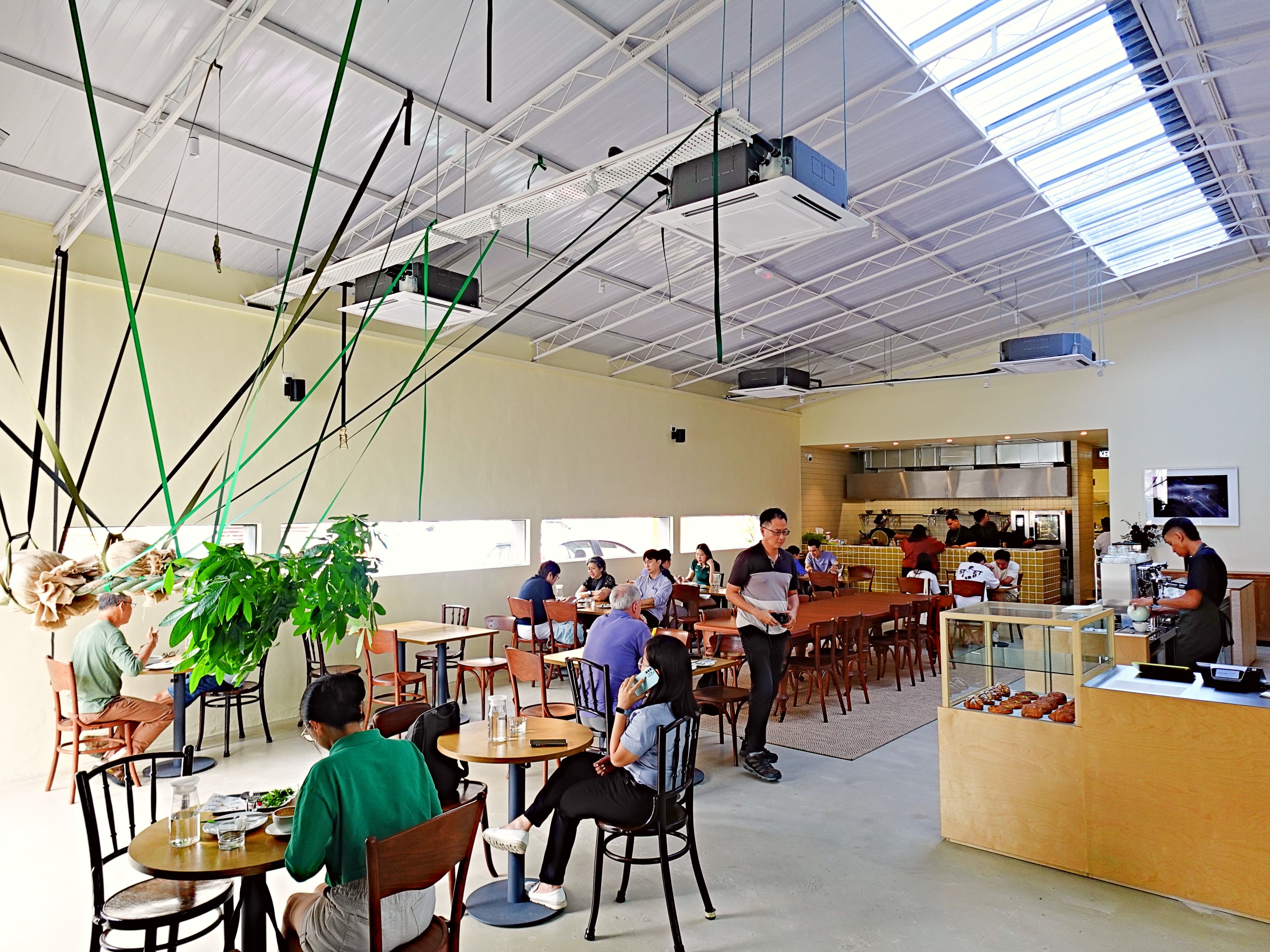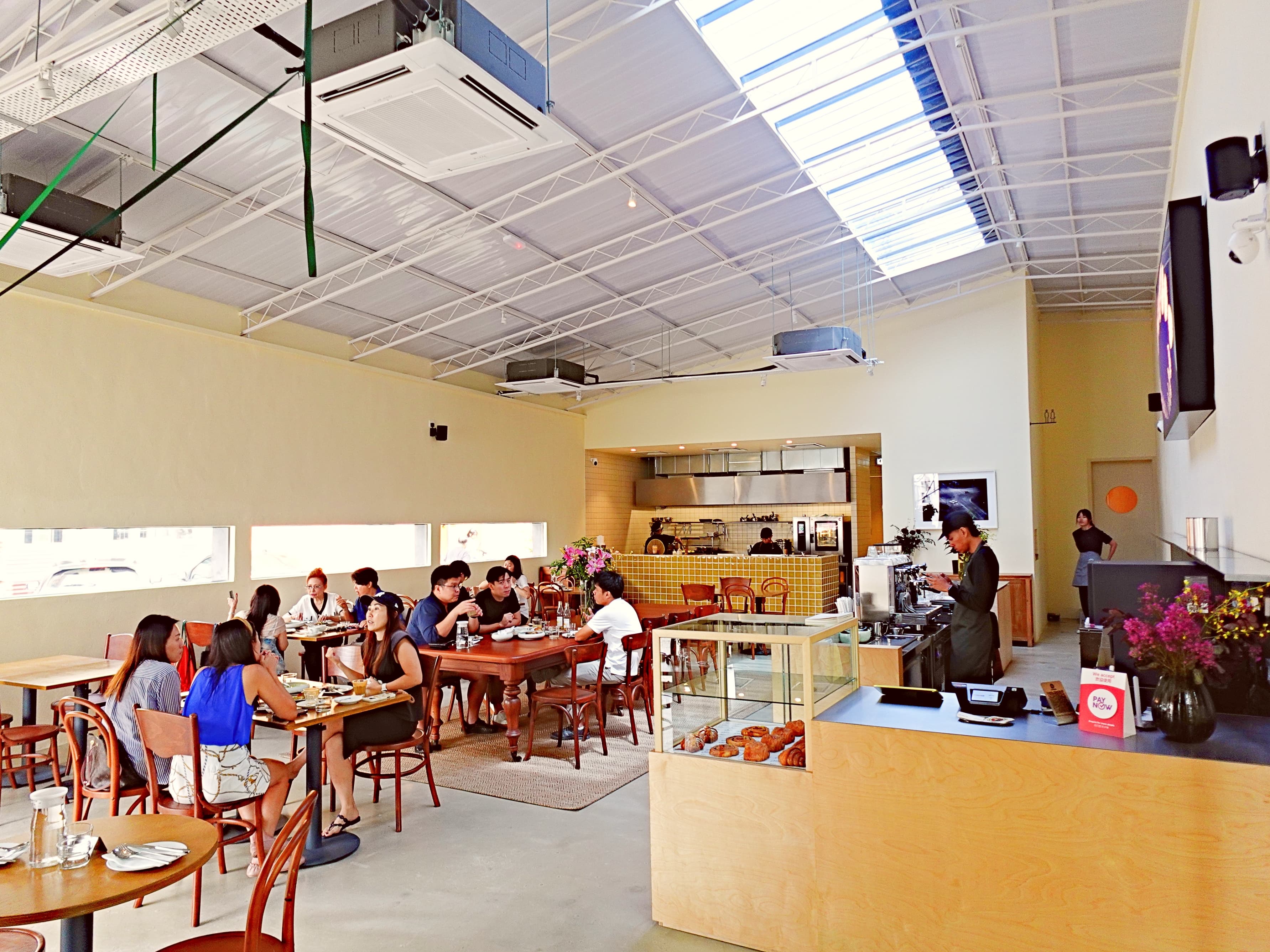 The restaurant looks like a rusty corrugated iron-cladded warehouse on the outside, but is a bright, airy, ultra-modern space inside.
