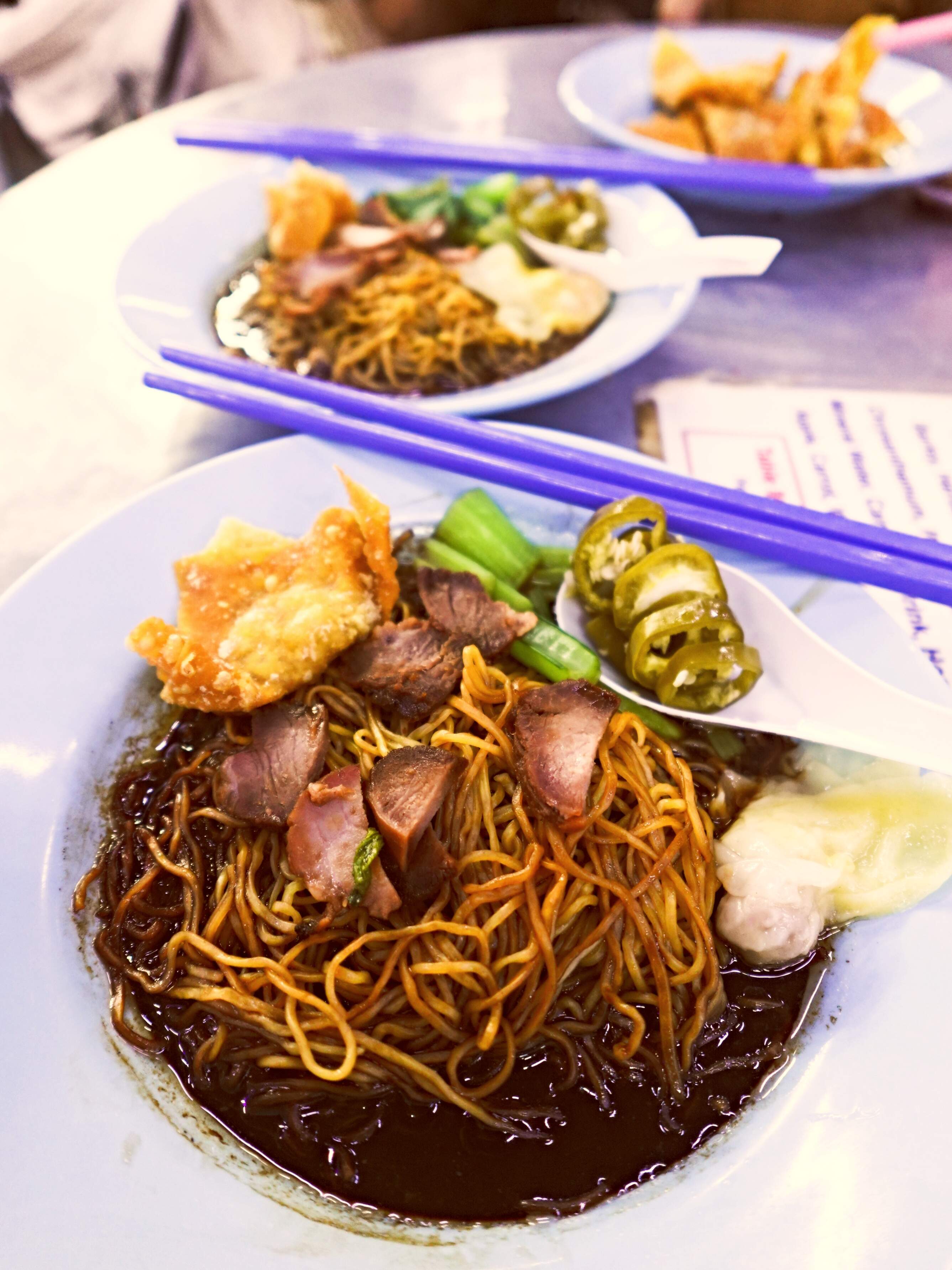 - Wantan noodles - this is the Penang version, unlike the soupy Hong Kong variety, and much tastier than Singapore’s Hakka-inflected versions. The Penang wantan noodles is a variation upon the Kuala Lumpur version (which happens to be my favourite), i.e. springy thin wheat noodles dressed in pork lard, dark & light soysauces, sesame oil, drippings from the char-siu (caramelised BBQ pork) and various other condiments. Penang wantan noodles are closer to the Hongkong one in terms of its al dente texture.