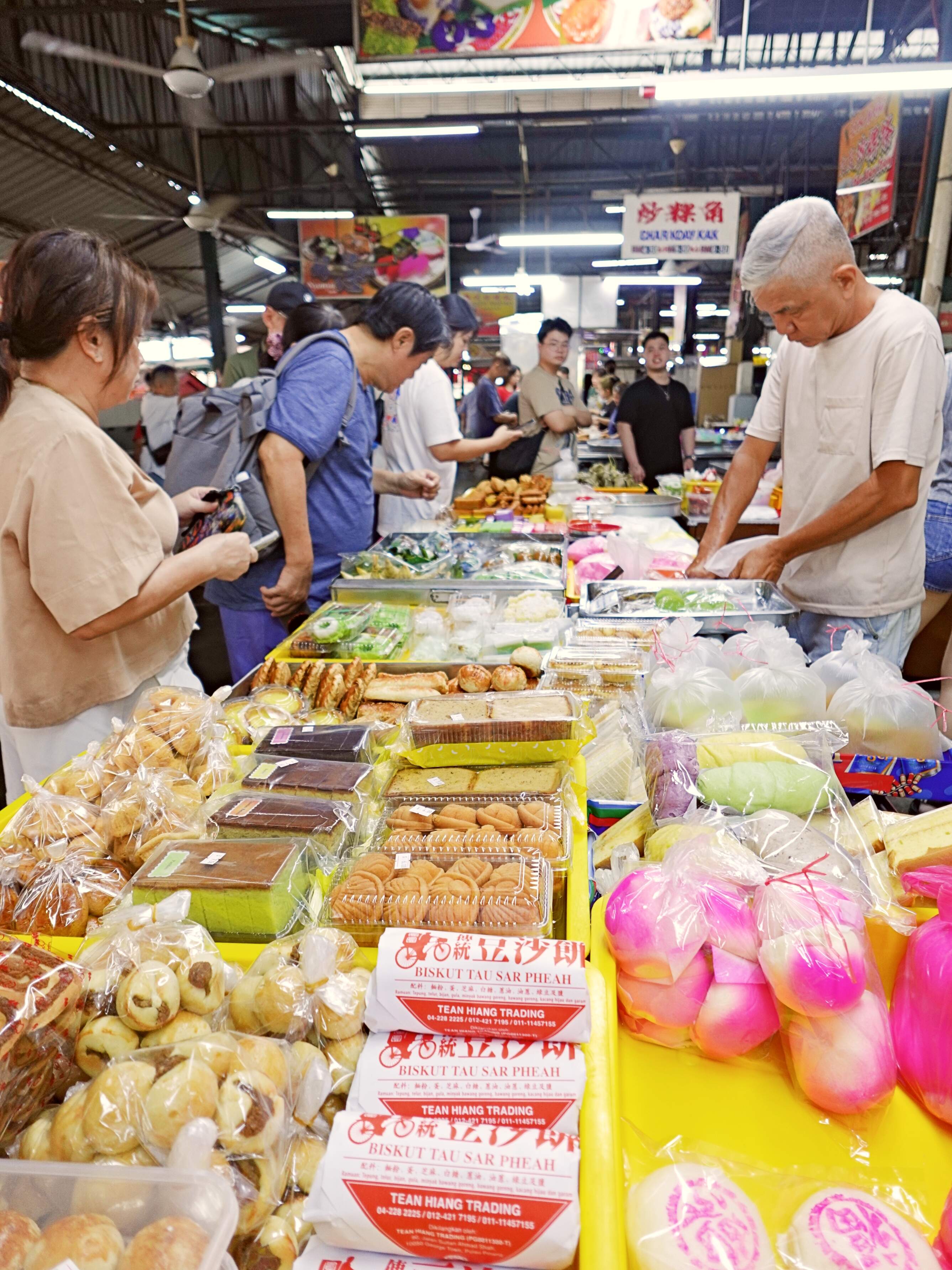 The two very popular Nyonya kueh stalls, located side-by-side in the market. Each offers 30-40 types of savory snacks, cakes and sweetmeats.