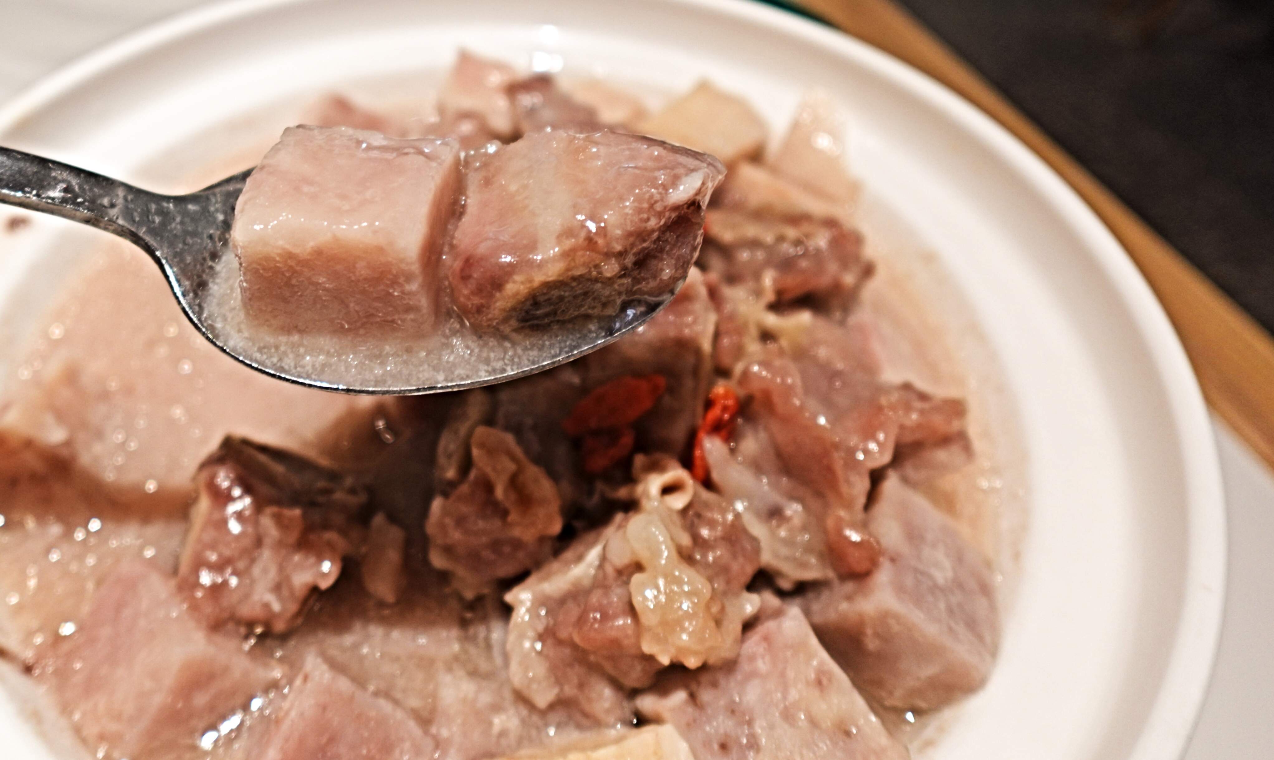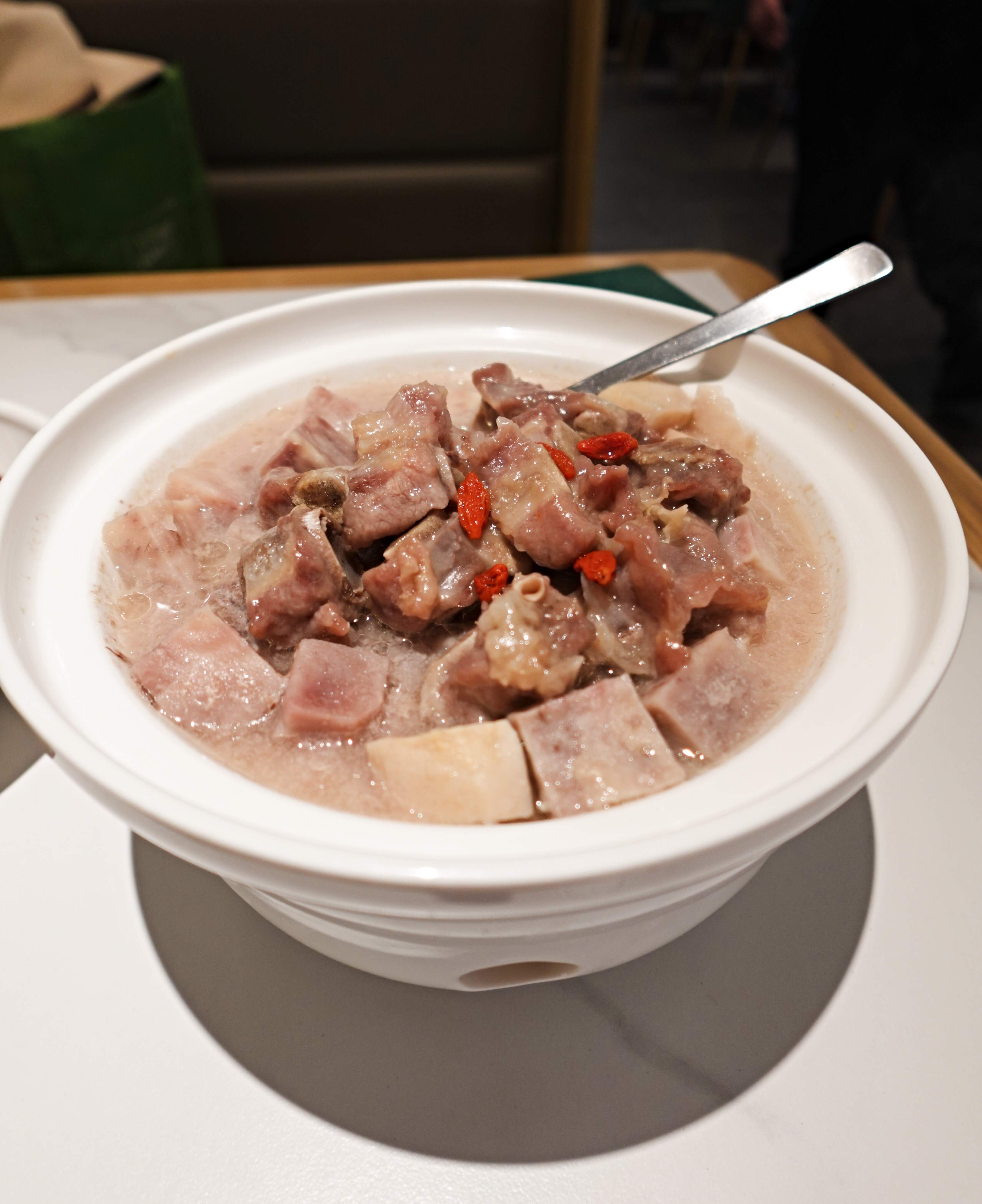 Stewed taro with pork spare-ribs - very flavorsome stew of cubed taro with pork spare-ribs, topped with wolfberries. Perfect balance of flavors - earthy, savory, and garlicky. The pork-ribs, cut into short-lengths, were fall-off-the-bone tender.