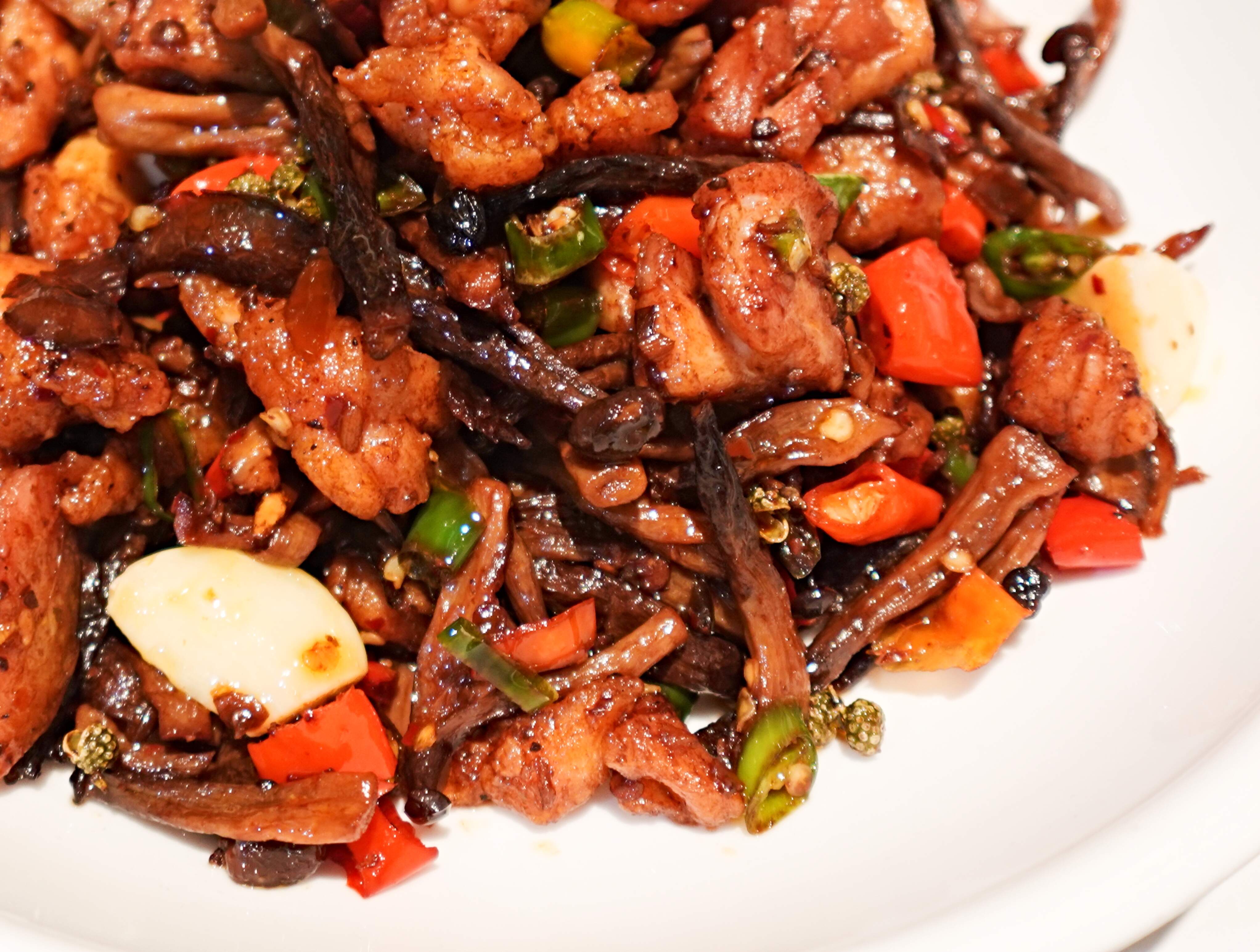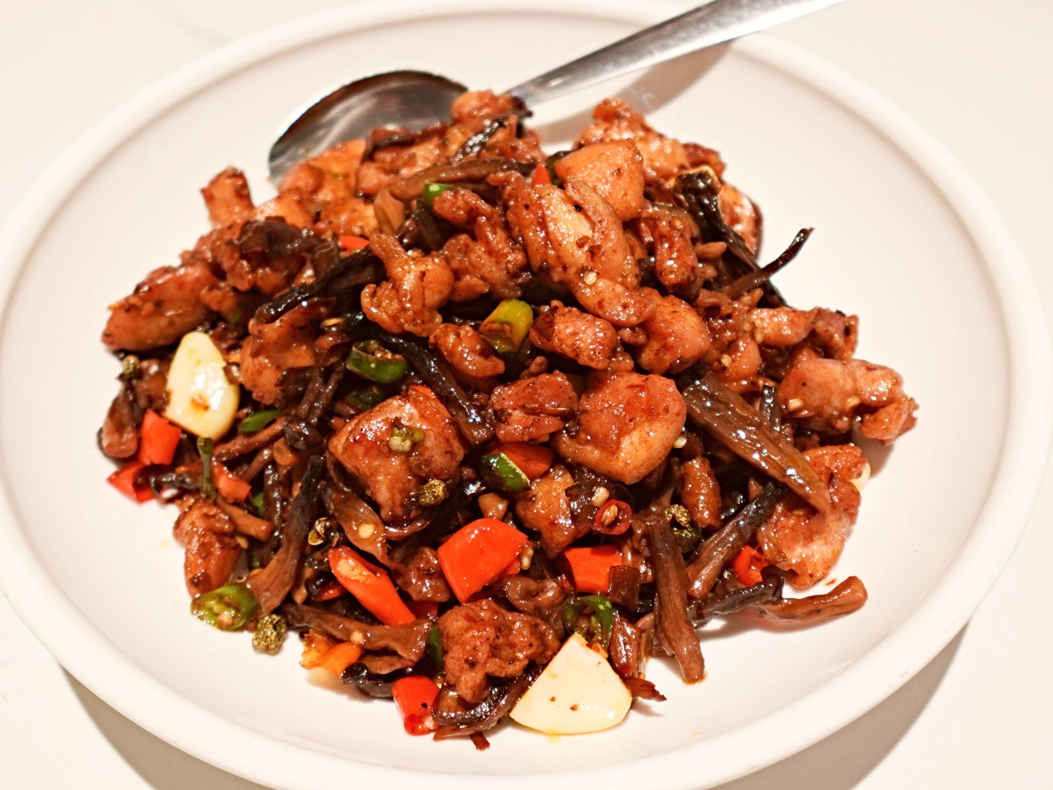 Chicken with deer antler mushrooms and two types of peppers - aggressively-flavored dish, with a distinct numbing sensation from the Sichuan peppercorns used. The brown-hued dried deer antler mushrooms were rehydrated before being stir-fried with the boneless chicken cubes and copious amounts of whole garlic pips. Tasty, but much spicier than I could handle.